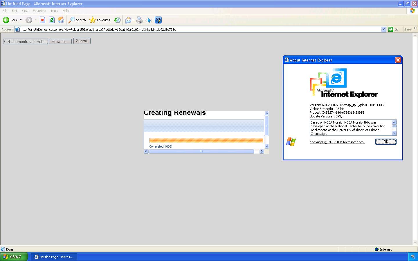 This is using 2009Q3 Rad Ajax., .NET Framework 2 in Visual Studio 2005. I have a RadWindow, and it it's content template it has a Rad Progress Area. In the OnClientProgressStarted even of the Progress Manager it calls the following JavaScript. The Javascript writes a title into the Progress Bar's Top Panel, Disables some tabs in the Radtabstrip and then shows and centers the Rad Window. It works great in IE8, but in IE6 the screen gets disabled but the rad window never appears. Attached are two screen captures demonstrating this.