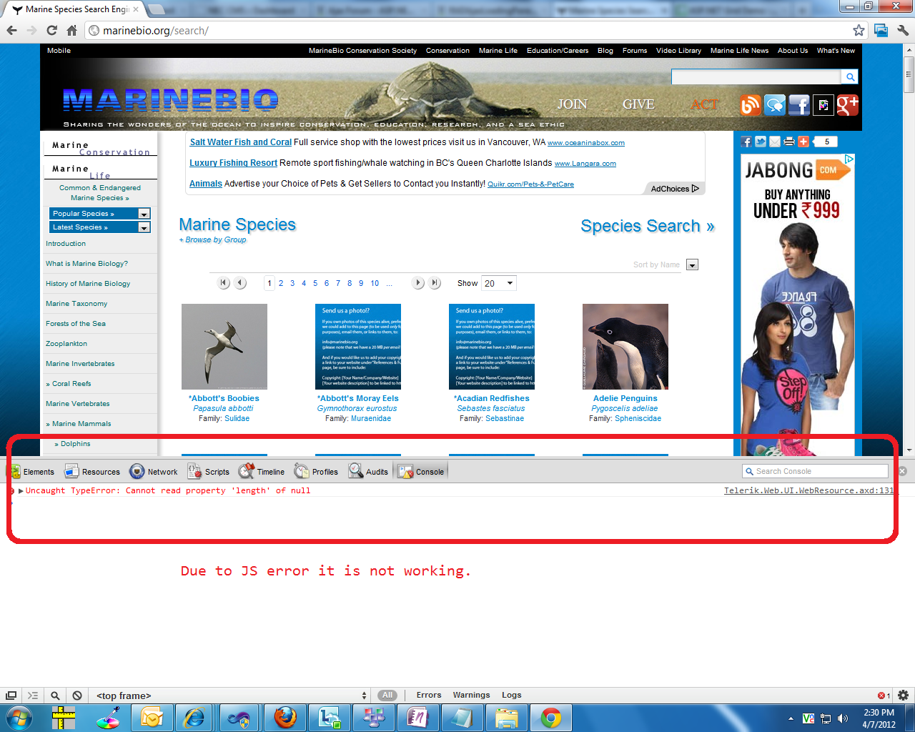 <telerik:RadAjaxPanel ID="RadAjaxPanel1" runat="server" LoadingPanelID="RadAjaxLoadingPanel1"><h1><a href="/search/">Marine Species</a></h1><h6 onclick="expandcontent('groups1')" style="cursor:hand;cursor:pointer">+ Browse by Group</h6><div id="groups1" class="switchcontent">....<div class="mb-sort"><asp:DropDownList ID="SortDropDownList" runat="server" AutoPostBack="True" OnSelectedIndexChanged="SortDropDownList_SelectedIndexChanged"> <asp:ListItem Value="comname">Sort by Name</asp:ListItem> <asp:ListItem Value="family">Sort by Family</asp:ListItem> <asp:ListItem Value="genus">Sort by Genus</asp:ListItem></asp:DropDownList></div><telerik:RadListView ID="SearchRadListView" runat="server" ItemPlaceholderID="ItemPlaceHolder" DataKeyNames="id" DataSourceID="SearchSqlDataSource" AllowPaging="True" PageSize="12" BackColor="White"> <LayoutTemplate> <div><div style="clear:both;width:660px;margin:0 auto 0;font-size:11px;"> <telerik:RadDataPager ID="RadDataPager2" runat="server" PageSize="12" PagedControlID="SearchRadListView" Skin="Sitefinity"> <Fields> <telerik:RadDataPagerButtonField FieldType="FirstPrev" /> <telerik:RadDataPagerButtonField FieldType="Numeric" /> <telerik:RadDataPagerButtonField FieldType="NextLast" /> <telerik:RadDataPagerPageSizeField PageSizeText="Show" /> </Fields> </telerik:RadDataPager> </div> <asp:PlaceHolder ID="ItemPlaceHolder" runat="server"></asp:PlaceHolder> <div style="clear:both;width:660px;margin:0 auto 0;font-size:11px;"> <telerik:RadDataPager ID="RadDataPager1" runat="server" PageSize="12" PagedControlID="SearchRadListView" Skin="Sitefinity"> <Fields> <telerik:RadDataPagerButtonField FieldType="FirstPrev" /> <telerik:RadDataPagerButtonField FieldType="Numeric" /> <telerik:RadDataPagerButtonField FieldType="NextLast" /> <telerik:RadDataPagerPageSizeField PageSizeText="Show" /> </Fields> </telerik:RadDataPager> </div></div> </LayoutTemplate> <itemtemplate> <div class="mb-results" style="text-align:center;"><div> <asp:HyperLink ID="imageHyperLink" runat="server" NavigateUrl='<%# "~/species.asp?id="&Eval("id")%>'> <asp:Image ID="Image1" runat="server" AlternateText='<%# Eval("comname")&" - "&Eval("GenusName")&" "&Eval("SpeciesName")%>' ImageUrl='<%# Eval("pic")%>' CssClass="mbphotos" /> </asp:HyperLink></div> <asp:HyperLink ID="speciesHyperLink" runat="server" NavigateUrl='<%# "~/species.asp?id="&Eval("id")%>' ><strong><%# Eval("comnamestatus")%></strong><br /><em><%# Eval("GenusName")&" "&Eval("SpeciesName")%></em> </asp:HyperLink><br />Family: <asp:HyperLink ID="HyperLink1" runat="server" NavigateUrl='<%# "~/search/?family="&Eval("FamilyName")%>' Text='<%# Eval("FamilyName")%>' /></div> </itemtemplate> <EmptyDataTemplate> <div id="mberror"><span class="mberror">Oh crab... no species were found that match your search criteria...</span><br /><br />Please <a href="/search/adv/">modify your search</a> and try again or <a href="/oceans/contact/">contact us</a> to report it and we will look into it asap. Thank you, Best Fishes!</div> </EmptyDataTemplate> </telerik:RadListView> </telerik:RadAjaxPanel> <telerik:RadAjaxLoadingPanel ID="RadAjaxLoadingPanel1" runat="server" Skin="Default"></telerik:RadAjaxLoadingPanel>