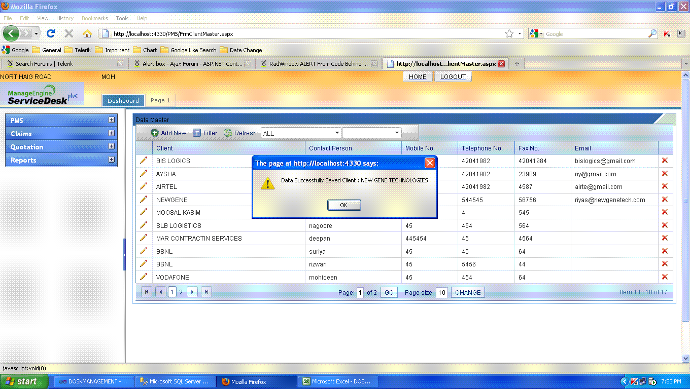 RadAjaxManager1.Alert("Data Successfully Saved \r\n Client : " + odsdatamaster.clientname);