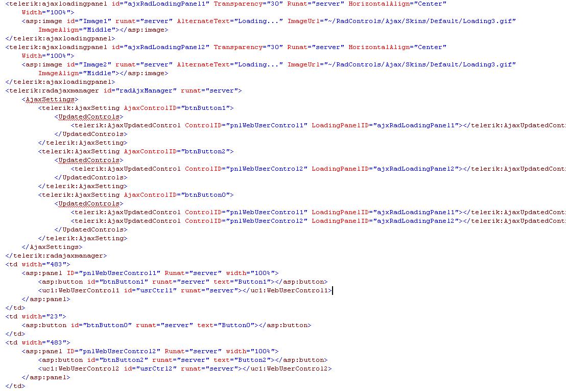Now when i click Button0, I can see two AjaxLoadingPanel over each WebUserControl. Since each WebUserControl have a different sleep time, I would expect that the AjaxLoadingPanel of WebUserControl1 disapear before the AjaxLoadingPanel of WebUserControl2. Therefore, both AjaxLoadingPanel disapear at the same time.