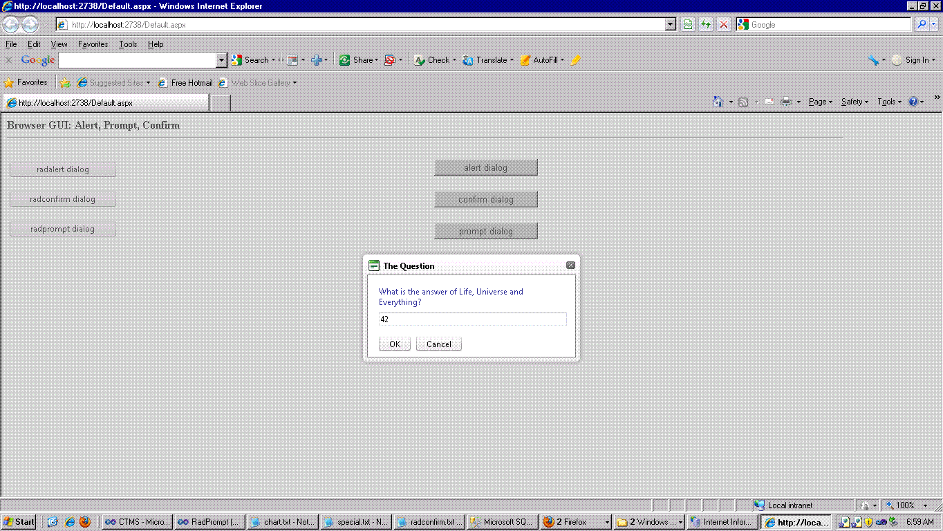 <button style="width: 150px" onclick="radprompt('<span style=\'color: #333399;\'>What is the answer of Life, Universe and Everything?</span>', promptCallBackFn, 330, 160, null, 'The Question', '42'); return false;">