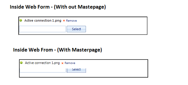 We are using 2013 ASP.NET Ajax Q2 version. When we click side to the RadAsynUpload control it is hiding top portion of the control's. This issue only If we place control inside a webform with master page. Working fine without masterpage.