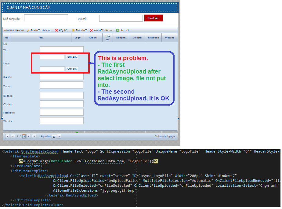 However, when RadAsyncUpload control in RadGrid, it it duplicated into 2 controls that the same in EditMode (Insert and Upload mode).