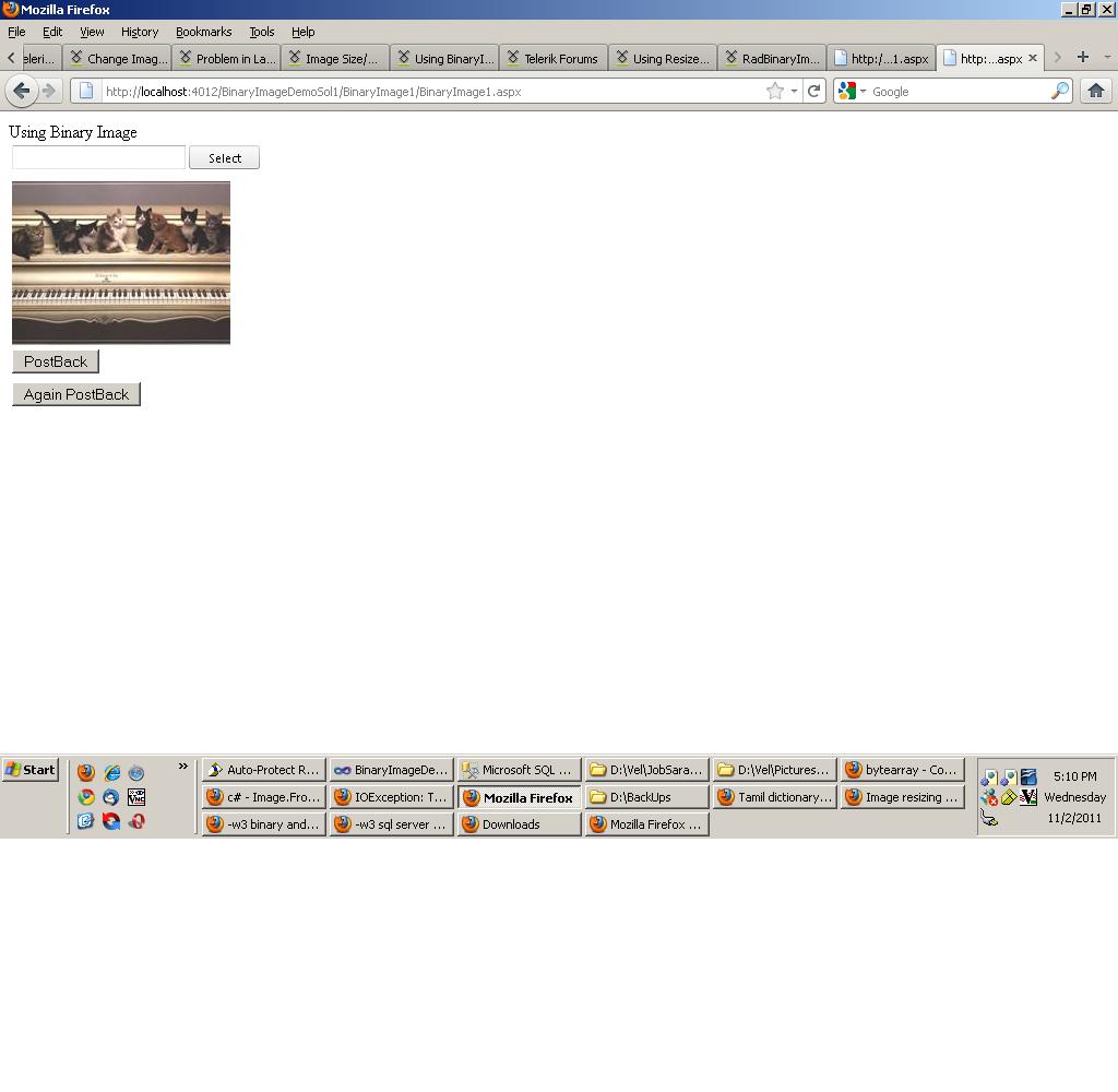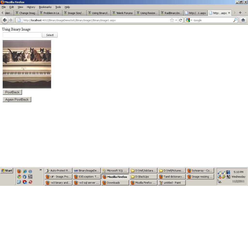 protected void Page_Load(object sender, EventArgs e) { binaryimage1.Height = Unit.Pixel(200); binaryimage1.Width = Unit.Pixel(200); b1.Click += new EventHandler(b1_Click); }void b1_Click(object sender, EventArgs e) { foreach (Telerik.Web.UI.UploadedFile file in uploader.UploadedFiles) { byte[] bytes = new byte[file.ContentLength]; string fname = file.FileName.ToString(); int length = bytes.Length; file.InputStream.Read(bytes, 0, file.ContentLength); SqlConnection dbconn = new SqlConnection(strconn); try { string Query = "INSERT INTO RadBinaryImageDemo (ImageData,ImageName) VALUES " + " (@imgdata,@imgname)"; SqlCommand cmd = new SqlCommand(Query, dbconn); SqlParameter[] param = new SqlParameter[2]; cmd.Parameters.AddWithValue("@imgdata",bytes); cmd.Parameters.AddWithValue("@imgname", file.FileName); dbconn.Open(); cmd.ExecuteNonQuery(); DataTable d1 = new DataTable(); string Query1 = "select ImageData from RadBinaryImageDemo where ImageName='" + fname + "'"; SqlDataAdapter sqldadap = new SqlDataAdapter(Query1, dbconn); sqldadap.Fill(d1); byte[] imgdata = ((byte[])d1.Rows[0]["ImageData"]); binaryimage1.DataValue = imgdata; } finally { dbconn.Close(); } } }19 Answers, 1 is accepted