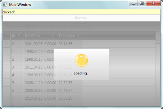 <Window x:Class="RadBusyIndicatorDemo.MainWindow" xmlns:telerik="http://schemas.telerik.com/2008/xaml/presentation" Title="MainWindow" Height="350" Width="525" WindowStartupLocation="CenterScreen"> <StackPanel> <TextBlock x:Name="textBlock" /> <telerik:RadBusyIndicator IsBusy="True"> <StackPanel> <Button Content="Button1" Click="Button_Click"/> <telerik:RadGridView ItemsSource="{Binding Items}" Height="300" /> </StackPanel> </telerik:RadBusyIndicator> </StackPanel></Window>MainWindow.xaml.cs