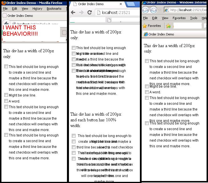 <div style="width:200px;"> <p>This div has a width of 200px only:</p> <dl> <dt> <telerik:RadButton runat="server" ID="MyButton1" ButtonType="ToggleButton" ToggleType="CheckBox" AutoPostBack="false" Text="This text should be long enough to create a second line and maybe a third line because the next checkbox will overlaps with this one and maybe more." /> </dt> <dt> <telerik:RadButton runat="server" ID="RadButton1" ButtonType="ToggleButton" ToggleType="CheckBox" AutoPostBack="false" Text="Might be one line." /> </dt> <dt> <telerik:RadButton runat="server" ID="RadButton2" ButtonType="ToggleButton" ToggleType="CheckBox" AutoPostBack="false" Text="A word." /> </dt> <dt> <telerik:RadButton runat="server" ID="RadButton3" ButtonType="ToggleButton" ToggleType="CheckBox" AutoPostBack="false" Text="This text should be long enough to create a second line and maybe a third line because the next checkbox will overlaps with this one and maybe more." /> </dt> <dt> <telerik:RadButton runat="server" ID="RadButton4" ButtonType="ToggleButton" ToggleType="CheckBox" AutoPostBack="false" Text="This text should be long enough to create a second line and maybe a third line because the next checkbox will overlaps with this one and maybe more." /> </dt> </dl></div>And i get diferent behavior in Chrome IE and Firefox.