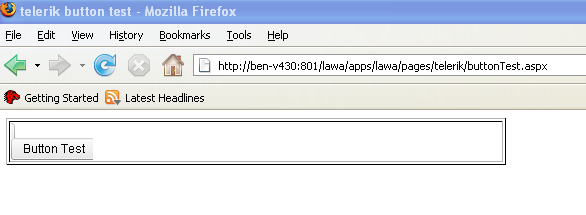 <%@ Page Language="C#" AutoEventWireup="true" CodeBehind="buttonTest.aspx.cs" Inherits="LAWA.Portal.apps.lawa.pages.telerik.buttonTest" %><%@ Register Assembly="Telerik.Web.UI" Namespace="Telerik.Web.UI" TagPrefix="telerik" %><!DOCTYPE html PUBLIC "-//W3C//DTD XHTML 1.0 Transitional//EN" "http://www.w3.org/TR/xhtml1/DTD/xhtml1-transitional.dtd"><html xmlns="http://www.w3.org/1999/xhtml"><head runat="server"> <title>telerik button test</title></head><body> <form id="form1" runat="server"> <asp:ScriptManager ID="ScriptManager1" runat="server"> </asp:ScriptManager> <table width="500px" border="1"> <tr> <td > <telerik:RadButton ID="btnTest" runat="server" Text="Button Test"/> </td> </tr> </table> </form></body></html>