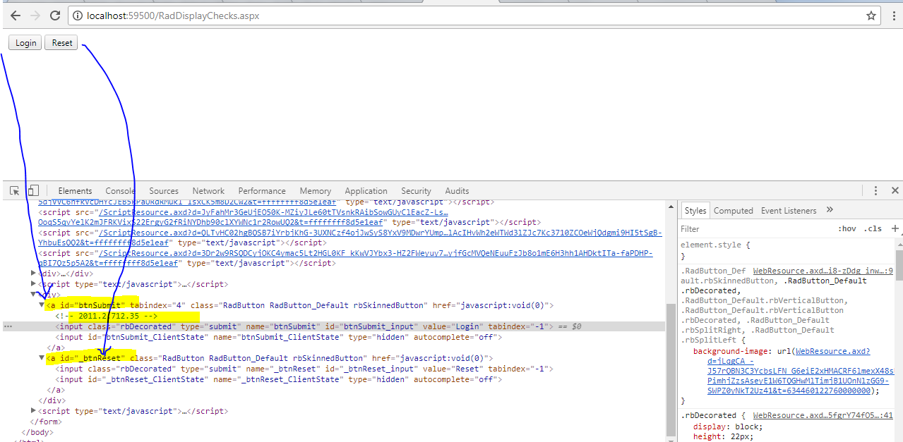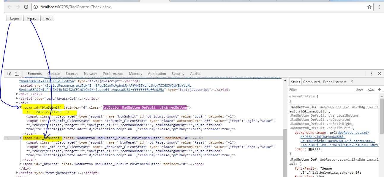 Please check the below,screenshots... in that rad button are rendered in chrome browser (Version 59.0.3071.115 (Official Build) (64-bit) ) as <a .. ></a> tag. but with latest version telerik dll, it displayed as <span> </span>.