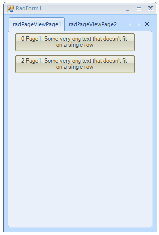 // For tab 1RadButton b = new RadButton();b.EnableTheming = true;b.ThemeName = new DesertTheme().ThemeName;b.Name = n;b.Text = n;b.Left = 10;b.Top = (22 * i++);b.MinimumSize = new Size(ptp1.Width - 40, 20);b.MaximumSize = new Size(ptp1.Width - 40, 0);b.AutoSize = true;b.Padding = new Padding(4);((TextPrimitive)b.ButtonElement.Children[1].Children[1]).TextWrap = true;b.RootElement.StretchVertically = false;b.TextAlignment = ContentAlignment.MiddleCenter;b.Click += new EventHandler(onBtnRechercheClick);tt.SetToolTip(b, b.Name);ptp1.WindowsControl.Controls.Add(b);
