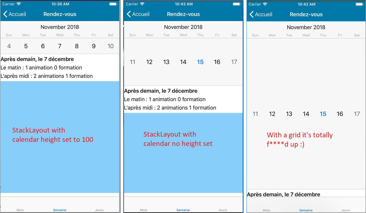 Exemple : a Calendar inside a grid vs a calendar inside a stacklayout. With a row set to Auto, it should behave the same. But it seems that the Calendar is taking all the available height like if the row's height was a star instead of auto.