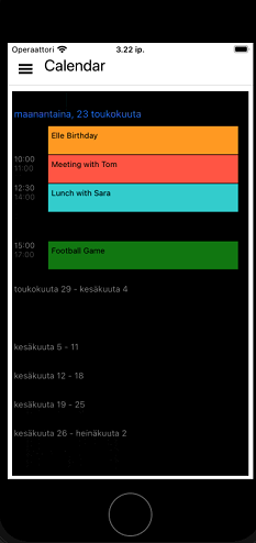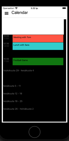 using System; using System.Collections.ObjectModel; using Telerik.XamarinForms.Input; using Xamarin.Forms; namespace TestiAppis { public class CalendarCopy : ContentPage { private RadCalendar calendar = null; public ObservableCollection<Appointment> Appointments { get; set; } public CalendarCopy() { var date = DateTime.Today; this.Appointments = new ObservableCollection<Appointment> { new Appointment { Title = "Meeting with Tom", Detail = "Sea Garden", StartDate = date.AddHours(10), EndDate = date.AddHours(11), Color = Color.Tomato }, new Appointment { Title = "Lunch with Sara", Detail = "Restaurant", StartDate = date.AddHours(12).AddMinutes(30), EndDate = date.AddHours(14), Color = Color.DarkTurquoise }, new Appointment { Title = "Elle Birthday", StartDate = date.AddHours(9), EndDate = date.AddHours(11), Color = Color.Orange, IsAllDay = true }, new Appointment { Title = "Football Game", StartDate = date.AddDays(2).AddHours(15), EndDate = date.AddDays(2).AddHours(17), Color = Color.Green }, }; calendar = TelerikCalendar(); Content = Get(); } private StackLayout Get() { StackLayout stack = new StackLayout { BackgroundColor = Color.Black, Margin = new Thickness(7, 10, 7, 5), HorizontalOptions = LayoutOptions.FillAndExpand, VerticalOptions = LayoutOptions.FillAndExpand, Children = { calendar } }; return stack; } private RadCalendar TelerikCalendar() { AgendaViewSettings agendaViewSettings = new AgendaViewSettings { MonthItemFormat = "MMM yyyy", DayItemFormat = "EEEE d.MMM", AppointmentItemTimeFormat = "HH.mm", IsHeaderSticky = false, StickyHeaderFormat = "MMM yyyy", }; calendar = new RadCalendar { ViewMode = CalendarViewMode.Agenda, HorizontalOptions = LayoutOptions.FillAndExpand, VerticalOptions = LayoutOptions.FillAndExpand, AgendaViewSettings = agendaViewSettings, Margin = new Thickness(0, 0, 13, 0), SchedulingUiEnabled = false, IsAddAppointmentButtonVisible = false, DisplayDate = DateTime.Now, AppointmentsSource = this.Appointments, BackgroundColor = Color.Black, }; return calendar; } private StackLayout GetTitleView() { Label title = new Label() { Text = "Calendar", FontSize = 24, TextColor = Color.Black, }; StackLayout stack = new StackLayout() { Orientation = StackOrientation.Horizontal, Margin = new Thickness(0, 15, 0, 3), VerticalOptions = LayoutOptions.Center, HorizontalOptions = LayoutOptions.EndAndExpand, Spacing = 10, Children = { title } }; return stack; } protected override void OnAppearing() { base.OnAppearing(); App.Current.Resources["backColor"] = Color.White; App.Current.Resources["foreColor"] = Color.Black; Shell.SetTitleView(this, GetTitleView()); Shell.SetNavBarHasShadow(this, false); } } }Hi,