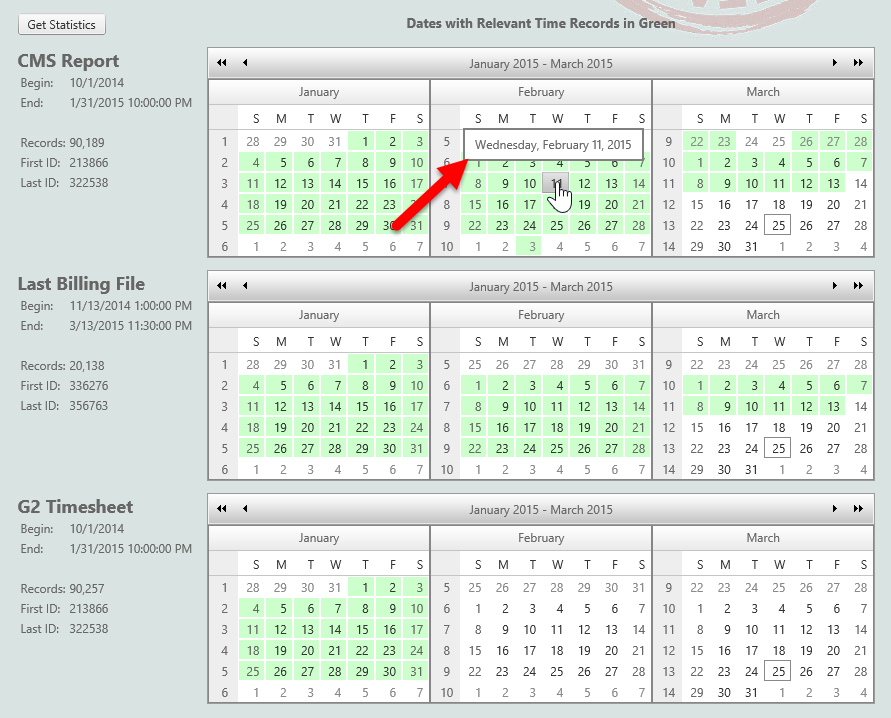 <%@ Page Title="" Language="vb" AutoEventWireup="false" MasterPageFile="~/masterpages/OneColumn.master" CodeBehind="ReconcileTime.aspx.vb" Inherits="SOREOIB.ReconcileTime" %><%@ Register Src="~/controls/pickers/CustomerPicker.ascx" TagName="CustomerPicker" TagPrefix="uc1" %><%@ Register Src="~/controls/pickers/EmployeePicker.ascx" TagName="EmployeePicker" TagPrefix="uc2" %><%@ Register Src="~/controls/linkers/ContactLink.ascx" TagName="ContactLink" TagPrefix="uc3" %><%@ Register Src="~/controls/pickers/AuthorizationPicker.ascx" TagName="AuthorizationPicker" TagPrefix="uc4" %><%@ Register Src="~/controls/linkers/AuthorizationLink.ascx" TagName="AuthorizationLink" TagPrefix="uc5" %><%@ Register Src="../../../controls/pickers/ServiceCodePicker.ascx" TagName="ServiceCodePicker" TagPrefix="uc8" %><%@ Register Src="../../../controls/pickers/FundingOrganizationPicker.ascx" TagName="FundingOrganizationPicker" TagPrefix="uc6" %><%@ Register Src="../../../controls/BillingPeriodPicker.ascx" TagName="BillingPeriodPicker" TagPrefix="uc7" %><%@ Register Assembly="Telerik.OpenAccess.Web, Version=2014.3.1209.1, Culture=neutral, PublicKeyToken=7ce17eeaf1d59342" Namespace="Telerik.OpenAccess" TagPrefix="telerik" %><%@ Register src="controls/TimeForDay.ascx" tagname="TimeForDay" tagprefix="uc9" %><asp:Content ID="Content1" ContentPlaceHolderID="cphMain" runat="server"> <telerik:RadAjaxLoadingPanel ID="RadAjaxLoadingPanel1" runat="server"> </telerik:RadAjaxLoadingPanel> <script type="text/javascript"> function onRequestStart(sender, args) { if (args.get_eventTarget().indexOf("btnExportToExcel") >= 0) args.set_enableAjax(false); } </script> <div style="background-image: url(../../../images/betasoftware-s.jpg); background-repeat: no-repeat; background-position: right top;"> <table cellpadding="5"> <tr> <td rowspan="4"> <span style="position: relative; top: 15px;"> <asp:Image ID="Image1" runat="server" ImageAlign="AbsMiddle" ImageUrl="~/images/window_gear-m.png" /> </span> </td> <td> <h2>Step 1: Import Raw Time Report Data </h2> <div class="Instructions"> Import the raw <asp:Label ID="Label2" runat="server" Text="<%$ Resources:G3Resources, TimekeepingSystemName %>"></asp:Label> timesheet file using the form below. </div> </td> </tr> <tr> <td> <telerik:RadAsyncUpload ID="uplTimesheetDetailReportFile" runat="server" TargetFolder="~/App_Data/Temp"> </telerik:RadAsyncUpload> </td> </tr> <tr> <td> <telerik:RadAjaxLoadingPanel ID="RadAjaxLoadingPanel2" runat="server"> </telerik:RadAjaxLoadingPanel> <telerik:RadAjaxPanel ID="RadAjaxPanel2" LoadingPanelID="RadAjaxLoadingPanel2" ClientEvents-OnRequestStart="onRequestStart" runat="server" Width="300px" Height="50px"> <asp:Label ID="lblStatus" runat="server" Text="Ready."></asp:Label> <br /> <br /> <telerik:RadButton ID="btnImport" runat="server" Text="Import File"></telerik:RadButton> </telerik:RadAjaxPanel> </td> </tr> </table> <br /> <br /> <br /> <telerik:RadAjaxPanel ID="RadAjaxPanel1" LoadingPanelID="RadAjaxLoadingPanel1" ClientEvents-OnRequestStart="onRequestStart" runat="server"> </telerik:RadAjaxPanel> <table cellpadding="5"> <tr> <td rowspan="4"> <span style="position: relative; top: 15px;"> <asp:Image ID="Image2" runat="server" ImageAlign="AbsMiddle" ImageUrl="~/images/window_gear-m.png" /> </span> </td> <td colspan="4"> <h2>Step 2: Verify the content</h2> <div class="Instructions"> Verify that the dates within the source data are overlapping. </div> </td> </tr> <tr> <td colspan="4"> <table width="100%" cellpadding="5"> <tr> <td> <asp:Button ID="btnGetStatistics" runat="server" Text="Get Statistics" /> </td> <td align="center"> <span style="position:relative; font-size:larger; font-weight:bold;"> Dates with Relevant Time Records in Green </span> </td> </tr> <tr> <td> <div style="font-size: large; font-weight: bold;">CMS Report</div> <table> <tr> <td> Begin: </td> <td> <asp:Label ID="lblCMSReportStartDate" runat="server" Text="?"></asp:Label> </td> </tr> <tr> <td> End: </td> <td> <asp:Label ID="lblCMSReportEndDate" runat="server" Text="?"></asp:Label> </td> </tr> <tr> <td colspan="2"> </td> </tr> <tr> <td> Records: </td> <td> <asp:Label ID="lblCMSReportRecordCount" runat="server" Text="?"></asp:Label> </td> </tr> <tr> <td> First ID: </td> <td> <asp:Label ID="lblCMSReportFirstTimesheetID" runat="server" Text="?"></asp:Label> </td> </tr> <tr> <td> Last ID: </td> <td> <asp:Label ID="lblCMSReportLastTimesheetID" runat="server" Text="?"></asp:Label> </td> </tr> </table> </td> <td> <telerik:RadCalendar ID="datCMSReport" runat="server" EnableWeekends="True" FastNavigationNextText="<<" SelectedDate="" MultiViewColumns="3" AutoPostBack="false" CssClass="RadCalendarMultiView RadCalendarMultiView_Default"> <SpecialDays> <telerik:RadCalendarDay Date="" Repeatable="Today"> <ItemStyle CssClass="rcToday" /> </telerik:RadCalendarDay> </SpecialDays> <WeekendDayStyle CssClass="rcWeekend" /> <CalendarTableStyle CssClass="rcMainTable" /> <OtherMonthDayStyle CssClass="rcOtherMonth" /> <OutOfRangeDayStyle CssClass="rcOutOfRange" /> <DisabledDayStyle CssClass="rcDisabled" /> <SelectedDayStyle CssClass="rcSelected" /> <DayOverStyle CssClass="rcHover" /> <FastNavigationStyle CssClass="RadCalendarMonthView RadCalendarMonthView_Default" /> <ViewSelectorStyle CssClass="rcViewSel" /> </telerik:RadCalendar> </td> </tr> <tr id="rowLastImport" runat="server"> <td> <div style="font-size: large; font-weight: bold;">Last Billing File</div> <table> <tr> <td> Begin: </td> <td> <asp:Label ID="lblLatestBillingFileImportStartDate" runat="server" Text="?"></asp:Label> </td> </tr> <tr> <td> End: </td> <td> <asp:Label ID="lblLatestBillingFileImportEndDate" runat="server" Text="?"></asp:Label> </td> </tr> <tr> <td> </td> </tr> <tr> <td> Records: </td> <td> <asp:Label ID="lblLatestBillingFileImportRecordCount" runat="server" Text="?"></asp:Label> </td> </tr> <tr> <td> First ID: </td> <td> <asp:Label ID="lblLatestBillingFileImportFirstTimesheetID" runat="server" Text="?"></asp:Label> </td> </tr> <tr> <td> 