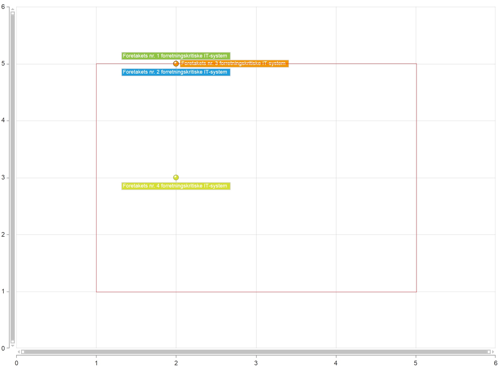 I have a chart where the both axis have minimum value 1 and maximum value 5. All data points are within this range on both axis. I don't want the data point labels to be "squished" in the edges when they have minimum/maximum values. Sometimes (even with smart labels) the data point labels overlap (bug in the control). So my idea was to "virtualize" the chart's minimum/maximum axis values so that the available plot area was enhanced. In the attached screen shot I have set the minimum/maximum axis to 1 and 6 and all the data points are within 1 to 5 (red area). So far so good, but to minimize the wasted space I'm trying to set the minimum/maximum to -0.5 and 0.5. However the axis labels then gets decimals on them 0,5 - 1,5 and so on even if the MajorStep, MajorInterval etc. are set to 1 (and I'm hiding the first/last label via LabelOffset and LastLabelVisibility). I want the labels to be 1-5. Can this be achieved and if so, how?