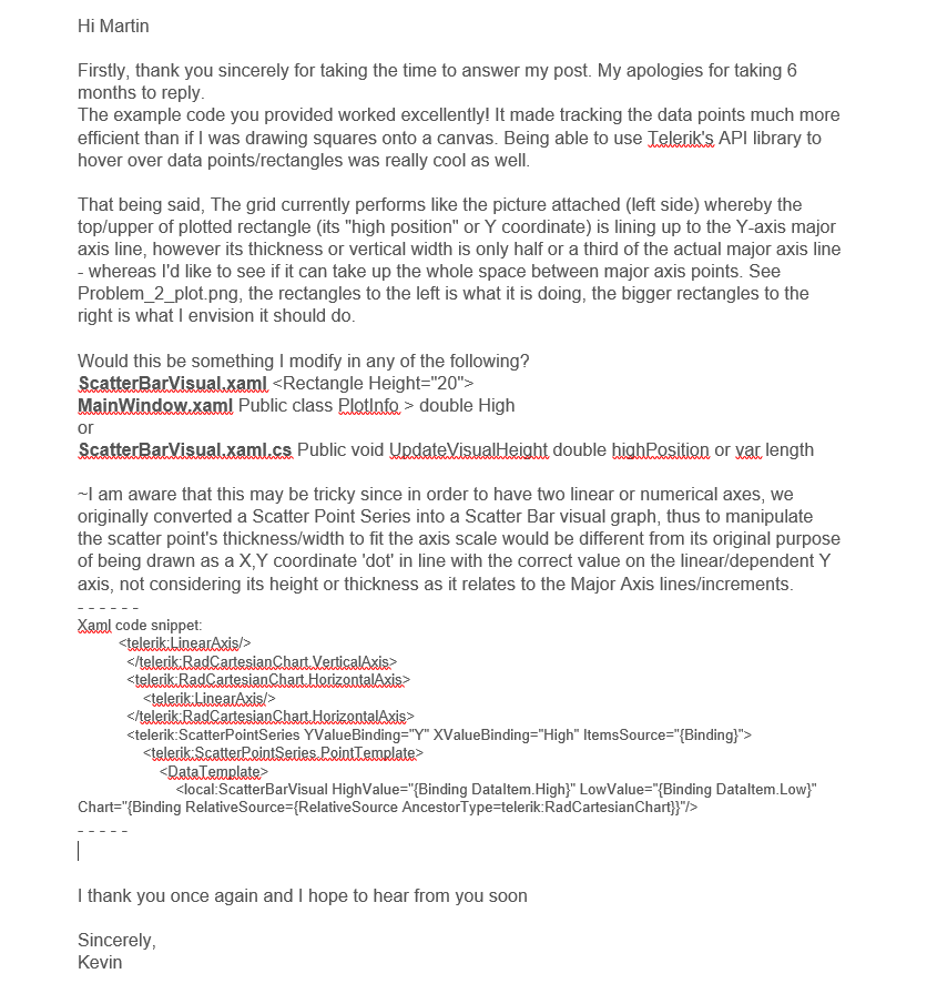 The example code you provided worked excellently! It made tracking the data points much more efficient than if I was drawing squares onto a canvas. Being able to use Telerik's API library to hover over data points/rectangles was really cool as well.