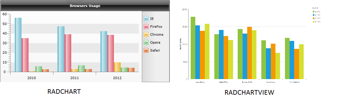 <Border Background="{Binding ElementName=RadChart1, Path=Palette.GlobalEntries[0].Fill}" CornerRadius="2"> <Rectangle RadiusX="{StaticResource BarRadiusX}" RadiusY="{StaticResource BarRadiusY}" OpacityMask="{StaticResource BarOpacityMaskBrush}" Fill="{StaticResource BarMaskBrush}" Stroke="{StaticResource BarMaskStroke}" StrokeThickness="{StaticResource BarMaskStrokeThickness}" /> </Border>I saw that you are referring to OpacityMask, RadiusX and RadiusY properties ... please mind that radChartView does not support such jewel look - the colors are flat , no gradients or masks are being used. To be able to use them you'll have to find the specific resources from the old chart and copy-paste them.