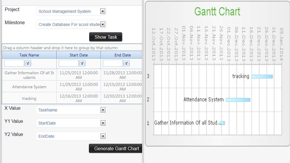 I am trying to develop gantt chart by using radchart control. up to this moment what i have done is here ,i have two drop down list first one is project name and second one is milestone name after clicking both drop down one grid will be displayed in which all task name and its start and end dates will be display related to that project and milestone. and i have shown that task name and its start date and its end date in the gantt chart on the yaxis2