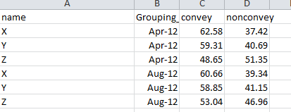 I have a data table which has 4 columns. They are Names,Date,Convey,NonConvey.