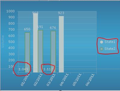 <telerik:RadChart ID="RadChart1" runat="server" DataGroupColumn="State" DataSourceID="ChartDS" IntelligentLabelsEnabled="True" SeriesPalette="Blue" Skin="DeepBlue"> <Appearance Corners="Rectangle, Rectangle, Round, Round, 5" Dimensions-Margins="0px, 1px, 1px, 1px" Dimensions-Paddings="0px, 1px, 1px, 1px"> <FillStyle FillType="ComplexGradient"> <FillSettings> <ComplexGradient> <telerik:GradientElement Color="26, 120, 179" /> <telerik:GradientElement Color="35, 189, 254" Position="0.5" /> <telerik:GradientElement Color="26, 120, 179" Position="1" /> </ComplexGradient> </FillSettings> </FillStyle> <Border Color="0, 66, 110" Width="0" Visible="False" /> </Appearance> <Series> <telerik:ChartSeries Name="State1" DataYColumn="VOLUME"> <Appearance> <FillStyle FillType="ComplexGradient"> <FillSettings> <ComplexGradient> <telerik:GradientElement Color="213, 247, 255" /> <telerik:GradientElement Color="193, 239, 252" Position="0.5" /> <telerik:GradientElement Color="157, 217, 238" Position="1" /> </ComplexGradient> </FillSettings> </FillStyle> <TextAppearance TextProperties-Color="White"> </TextAppearance> </Appearance> </telerik:ChartSeries> <telerik:ChartSeries DataYColumn="VOLUME" Name="State2"> <Appearance> <FillStyle FillType="ComplexGradient"> <FillSettings> <ComplexGradient> <telerik:GradientElement Color="163, 222, 78" /> <telerik:GradientElement Color="132, 207, 27" Position="0.5" /> <telerik:GradientElement Color="102, 181, 3" Position="1" /> </ComplexGradient> </FillSettings> </FillStyle> <TextAppearance TextProperties-Color="White"> </TextAppearance> <Border Color="94, 160, 0" /> </Appearance> </telerik:ChartSeries> </Series> <Legend> <Appearance Dimensions-Margins="1px, 2%, 12%, 1px" GroupNameFormat="#VALUE"> <ItemTextAppearance TextProperties-Color="White"> </ItemTextAppearance> <FillStyle GammaCorrection="False" MainColor="37, 255, 255, 255"> </FillStyle> <Border Color="76, 255, 255, 255" /> </Appearance> <TextBlock> <Appearance Position-AlignedPosition="Top" TextProperties-Color="LightSkyBlue"> </Appearance> </TextBlock> <ActiveRegion Tooltip="The two states to compare" /> </Legend> <PlotArea> <XAxis DataLabelsColumn="YYMM" IsZeroBased="False" MaxValue="7" MinValue="0"> <Appearance Color="98, 183, 226" MajorTick-Color="98, 183, 226"> <MajorGridLines Color="98, 183, 226" Width="0" /> <LabelAppearance RotationAngle="300" Position-AlignedPosition="Bottom"> </LabelAppearance> <TextAppearance TextProperties-Color="White"> </TextAppearance> </Appearance> <AxisLabel Visible="True"> <Appearance Dimensions-Paddings="1px, 1px, 10%, 1px" Visible="True"> </Appearance> <TextBlock Text="Month/Year"> <Appearance TextProperties-Color="LightSkyBlue"> </Appearance> </TextBlock> </AxisLabel> <Items> <telerik:ChartAxisItem> <TextBlock Text=" 01/2011"> </TextBlock> </telerik:ChartAxisItem> <telerik:ChartAxisItem Value="1"> <TextBlock Text=" 02/2011"> </TextBlock> </telerik:ChartAxisItem> <telerik:ChartAxisItem Value="2"> <TextBlock Text=" 03/2011"> </TextBlock> </telerik:ChartAxisItem> <telerik:ChartAxisItem Value="3"> <TextBlock Text=" 04/2011"> </TextBlock> </telerik:ChartAxisItem> <telerik:ChartAxisItem Value="4"> <TextBlock Text=" 05/2011"> </TextBlock> </telerik:ChartAxisItem> <telerik:ChartAxisItem Value="5"> <TextBlock Text=" 06/2011"> </TextBlock> </telerik:ChartAxisItem> </Items> </XAxis> <YAxis> <Appearance Color="98, 183, 226" MajorTick-Color="98, 183, 226" MinorTick-Color="98, 183, 226"> <MajorGridLines Color="120, 209, 248" /> <MinorGridLines Color="120, 209, 248" Width="0" /> <TextAppearance TextProperties-Color="White"> </TextAppearance> </Appearance> <AxisLabel Visible="True"> <Appearance Visible="True"> </Appearance> <TextBlock Text="Volume"> <Appearance TextProperties-Color="LightSkyBlue"> </Appearance> </TextBlock> </AxisLabel> </YAxis> <Appearance Dimensions-Margins="12%, 80px, 20%, 15%" SeriesPalette="Blue"> <FillStyle MainColor="50, 255, 255, 255" SecondColor="Transparent"> </FillStyle> <Border Color="97, 180, 223" /> </Appearance> </PlotArea> <ChartTitle> <Appearance Dimensions-Margins="8px, 10px, 8px, 6%"> <FillStyle MainColor=""> </FillStyle> <Border Visible="False" /> </Appearance> <TextBlock Text=""> <Appearance TextProperties-Color="White" TextProperties-Font="Tahoma, 9.75pt, style=Bold"> </Appearance> </TextBlock> </ChartTitle>