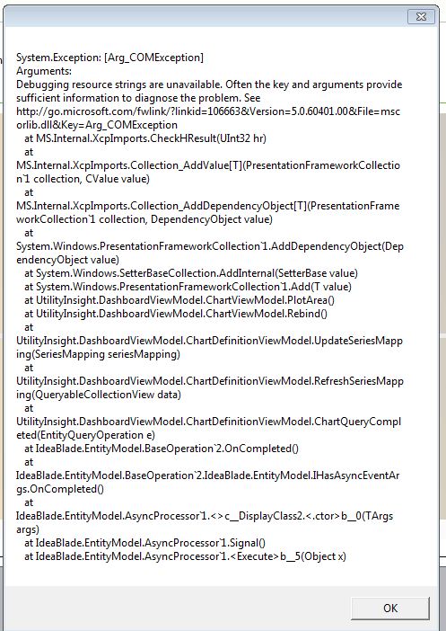 <Style x:Key="ClipPanelStyle" TargetType="telerik:ClipPanel"> <Setter Property="Background"> <Setter.Value> <LinearGradientBrush EndPoint="1,0" StartPoint="0,1" Opacity="0.5" SpreadMethod="Pad"> <GradientStop Color="Orange" Offset="0" /> <GradientStop Color="Black" Offset="1" /> </LinearGradientBrush> </Setter.Value> </Setter> </Style>var brush = new LinearGradientBrush { StartPoint = new Point(0, 1), EndPoint = new Point(1, 0) }; var stop1 = new GradientStop { Color = Colors.Purple, Offset = 0.0 }; brush.GradientStops.Add(stop1); var stop2 = new GradientStop { Color = Colors.Yellow, Offset = 1.0 }; brush.GradientStops.Add(stop2); _radChart.DefaultView.ChartArea.PlotAreaStyle.Setters.Add(new Setter() { Property = ClipPanel.BackgroundProperty, Value = brush });But when i am trying this i am getting attached error it actually worked for some time but i started getting this error all of a sudden