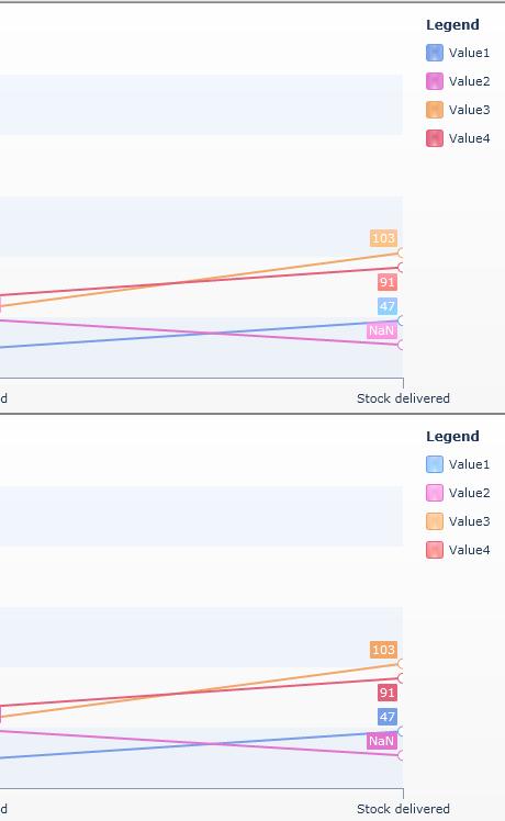 using System.Collections.Generic;using System.Windows.Controls;using System.Windows.Media;using Telerik.Windows.Controls;using Telerik.Windows.Controls.Charting;namespace SilverlightApplication1{ public partial class MainPage : UserControl { public MainPage() { InitializeComponent(); #region chart data FillRadchart1(); FillRadchart2(); var data = new List<User>(); data.Add(new User("Stock Ordered", 20, 37, 56, 67)); data.Add(new User("Stock Processed", 55, 120, 201, 33)); data.Add(new User("Stock Shipped", 23, 49, 55, 66)); data.Add(new User("Stock delivered", 47, 27, 103, 91)); RadChart1.ItemsSource = data; RadChart2.ItemsSource = data; #endregion new Windows7Theme().IsApplicationTheme = true; } /// <summary> /// RadChart1 has custom colours set for it. /// Notice the colours dont match 100% those used by Telerik for RadChart2. /// Note that it does match if we change the seriesdefinition to barseries. /// </summary> private void FillRadchart1() { var sm1 = new SeriesMapping(); var bar1 = new LineSeriesDefinition(); //var bar1 = new BarSeriesDefinition(); // note : change to bar series and the colours match RadChart2 sm1.SeriesDefinition = bar1; sm1.SeriesDefinition.Appearance.Fill = Resources["Colour1"] as LinearGradientBrush; sm1.SeriesDefinition.Appearance.Stroke = Resources["ColourStroke1"] as SolidColorBrush; sm1.SeriesDefinition.Appearance.PointMark.Stroke = Resources["ColourStroke1"] as SolidColorBrush; sm1.LegendLabel = "Value1"; var im1 = new ItemMapping(); im1.DataPointMember = DataPointMember.YValue; im1.FieldName = "Value1"; sm1.ItemMappings.Add(im1); im1 = new ItemMapping(); im1.DataPointMember = DataPointMember.XCategory; im1.FieldName = "Name"; sm1.ItemMappings.Add(im1); var sm2 = new SeriesMapping(); var bar2 = new LineSeriesDefinition {ItemLabelFormat = "#STSUM"}; sm2.SeriesDefinition = bar2; sm2.SeriesDefinition.Appearance.Fill = Resources["Colour2"] as LinearGradientBrush; sm2.SeriesDefinition.Appearance.Stroke = Resources["ColourStroke2"] as SolidColorBrush; sm2.SeriesDefinition.Appearance.PointMark.Stroke = Resources["ColourStroke2"] as SolidColorBrush; sm2.LegendLabel = "Value2"; var im2 = new ItemMapping(); im2.DataPointMember = DataPointMember.YValue; im2.FieldName = "Value2"; sm2.ItemMappings.Add(im2); im2 = new ItemMapping(); im2.DataPointMember = DataPointMember.XCategory; im2.FieldName = "Name"; sm2.ItemMappings.Add(im2); var sm3 = new SeriesMapping(); var bar3 = new LineSeriesDefinition(); sm3.SeriesDefinition = bar3; sm3.SeriesDefinition.Appearance.Fill = Resources["Colour3"] as LinearGradientBrush; sm3.SeriesDefinition.Appearance.Stroke = Resources["ColourStroke3"] as SolidColorBrush; sm3.SeriesDefinition.Appearance.PointMark.Stroke = Resources["ColourStroke3"] as SolidColorBrush; sm3.LegendLabel = "Value3"; var im3 = new ItemMapping(); im3.DataPointMember = DataPointMember.YValue; im3.FieldName = "Value3"; sm3.ItemMappings.Add(im3); im3 = new ItemMapping(); im3.DataPointMember = DataPointMember.XCategory; im3.FieldName = "Name"; sm3.ItemMappings.Add(im3); var sm4 = new SeriesMapping(); var bar4 = new LineSeriesDefinition(); sm4.SeriesDefinition = bar4; sm4.SeriesDefinition.Appearance.Fill = Resources["Colour4"] as LinearGradientBrush; sm4.SeriesDefinition.Appearance.Stroke = Resources["ColourStroke4"] as SolidColorBrush; sm4.SeriesDefinition.Appearance.PointMark.Stroke = Resources["ColourStroke4"] as SolidColorBrush; sm4.LegendLabel = "Value4"; var im4 = new ItemMapping(); im4.DataPointMember = DataPointMember.YValue; im4.FieldName = "Value4"; sm4.ItemMappings.Add(im4); im4 = new ItemMapping(); im4.DataPointMember = DataPointMember.XCategory; im4.FieldName = "Name"; sm4.ItemMappings.Add(im4); RadChart1.SeriesMappings.Add(sm1); RadChart1.SeriesMappings.Add(sm2); RadChart1.SeriesMappings.Add(sm3); RadChart1.SeriesMappings.Add(sm4); } /// <summary> /// RadChart2 has no custom colours set for it. Telerik auto populates the colours. /// Notice the more natural tone of colours, especially for the legend item. /// </summary> private void FillRadchart2() { var sm1 = new SeriesMapping(); var bar1 = new LineSeriesDefinition(); sm1.SeriesDefinition = bar1; sm1.LegendLabel = "Value1"; var im1 = new ItemMapping(); im1.DataPointMember = DataPointMember.YValue; im1.FieldName = "Value1"; sm1.ItemMappings.Add(im1); im1 = new ItemMapping(); im1.DataPointMember = DataPointMember.XCategory; im1.FieldName = "Name"; sm1.ItemMappings.Add(im1); var sm2 = new SeriesMapping(); var bar2 = new LineSeriesDefinition {ItemLabelFormat = "#STSUM"}; sm2.SeriesDefinition = bar2; sm2.LegendLabel = "Value2"; var im2 = new ItemMapping(); im2.DataPointMember = DataPointMember.YValue; im2.FieldName = "Value2"; sm2.ItemMappings.Add(im2); im2 = new ItemMapping(); im2.DataPointMember = DataPointMember.XCategory; im2.FieldName = "Name"; sm2.ItemMappings.Add(im2); var sm3 = new SeriesMapping(); var bar3 = new LineSeriesDefinition(); sm3.SeriesDefinition = bar3; sm3.LegendLabel = "Value3"; var im3 = new ItemMapping(); im3.DataPointMember = DataPointMember.YValue; im3.FieldName = "Value3"; sm3.ItemMappings.Add(im3); im3 = new ItemMapping(); im3.DataPointMember = DataPointMember.XCategory; im3.FieldName = "Name"; sm3.ItemMappings.Add(im3); var sm4 = new SeriesMapping(); var bar4 = new LineSeriesDefinition(); sm4.SeriesDefinition = bar4; sm4.LegendLabel = "Value4"; var im4 = new ItemMapping(); im4.DataPointMember = DataPointMember.YValue; im4.FieldName = "Value4"; sm4.ItemMappings.Add(im4); im4 = new ItemMapping(); im4.DataPointMember = DataPointMember.XCategory; im4.FieldName = "Name"; sm4.ItemMappings.Add(im4); RadChart2.SeriesMappings.Add(sm1); RadChart2.SeriesMappings.Add(sm2); RadChart2.SeriesMappings.Add(sm3); RadChart2.SeriesMappings.Add(sm4); } #region Nested type: User public class User { public User(string name, double value1, double value2, double value3, double value4) { Name = name; Value1 = value1; Value2 = value2; Value3 = value3; Value4 = value4; } public string Name { get; set; } public