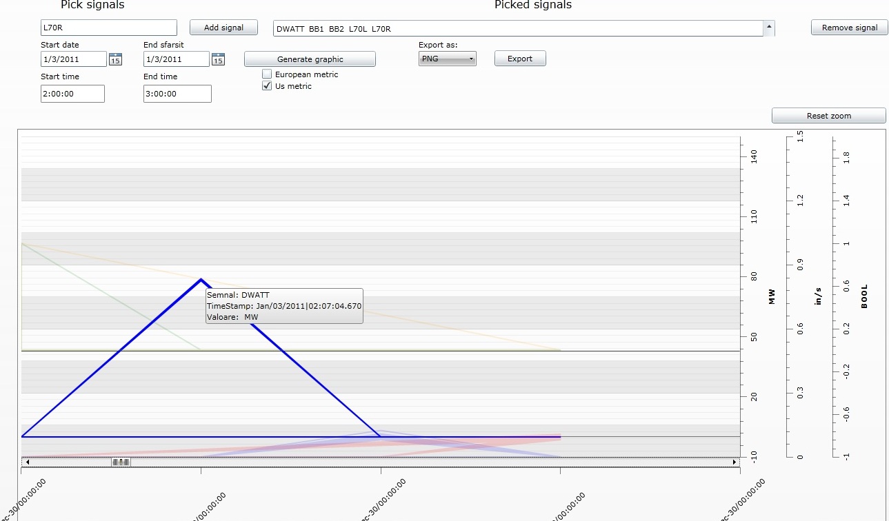 public void createSeriesCompleted(object sender, wcfService.createSeriesEngineer2CompletedEventArgs e) { SamplingSettings sSettings = new SamplingSettings(); radChart1.DefaultView.ChartArea.ZoomScrollSettingsX.ScrollMode = ScrollMode.ScrollAndZoom; radChart1.DefaultView.ChartArea.AxisY.AutoRange = false; radChart1.DefaultView.ChartArea.AxisY.Visibility = Visibility.Collapsed; radChart1.DefaultView.ChartArea.AxisX.DefaultLabelFormat = "MMM-dd/HH:mm:ss"; radChart1.DefaultView.ChartArea.AxisX.LabelRotationAngle = 315; radChart1.DefaultView.ChartArea.AxisX.StepLabelLevelCount = 2; radChart1.DefaultView.ChartArea.AxisX.StepLabelLevelHeight = 20; // radChart1.DefaultView.ChartArea.AxisY.DefaultLabelFormat = "VAL{0:C0}"; radChart1.DefaultView.ChartArea.AxisY.MajorGridLinesVisibility = Visibility.Visible; radChart1.DefaultView.ChartArea.AxisY.MinorGridLinesVisibility = Visibility.Visible; radChart1.DefaultView.ChartArea.AxisX.MajorGridLinesVisibility = Visibility.Visible; // radChart1.DefaultView.ChartArea.Padding = new Thickness(5, 10, 20, 5); // radChart1 radChart1.DefaultView.ChartArea.LabelFormatBehavior = LabelFormatBehavior.None; radChart1.SamplingSettings.SamplingThreshold = 200; // radChart1.DefaultView.ChartArea.ZoomScrollSettingsX.PropertyChanged += ZoomScrollSettingsX_PropertyChanged; radChart1.SamplingSettings.SamplingFunction = ChartSamplingFunction.KeepExtremes; radChart1.DefaultView.ChartArea.EnableAnimations = false; radChart1.DefaultView.ChartArea.EnableTransitionAnimations = false; radChart1.DefaultView.ChartArea.DataSeries.Clear(); radChart1.SeriesMappings.Clear(); radChart1.SeriesMappings = new SeriesMappingCollection(); for (int i = 0; i < semnale.Count; i++) { SeriesMapping temperatureMapping = new SeriesMapping(); LineSeriesDefinition lineDefinition = new LineSeriesDefinition();// LineSeriesDefinition(); lineDefinition.ShowItemLabels = false; lineDefinition.ShowItemToolTips = true; lineDefinition.ShowPointMarks = false; lineDefinition.InteractivitySettings.HoverScope = InteractivityScope.Series; lineDefinition.InteractivitySettings.SelectionScope = InteractivityScope.Series; lineDefinition.AxisName = "Axis"+i; temperatureMapping.SeriesDefinition = lineDefinition; temperatureMapping.ItemMappings.Add(new ItemMapping("point_id", DataPointMember.XCategory)); temperatureMapping.ItemMappings.Add(new ItemMapping("value" + (i + 1), DataPointMember.Tooltip)); //temperatureMapping.GroupingSettings.GroupDescriptors.Add(new ChartGroupDescriptor("point_id")); //temperatureMapping.GroupingSettings.ShouldCreateSeriesForLastGroup = true; temperatureMapping.ItemMappings.Add(new ItemMapping("timestamp", DataPointMember.XValue)); //temperatureMapping.ItemMappings.Add(new ItemMapping("value" + (i + 1), DataPointMember.YValue)); ItemMapping yItemMapping = new ItemMapping("value" + (i + 1), DataPointMember.YValue); yItemMapping.SamplingFunction = ChartSamplingFunction.KeepExtremes; temperatureMapping.ItemMappings.Add(yItemMapping); radChart1.SeriesMappings.Add(temperatureMapping); radChart1.DefaultView.ChartArea.LegendName = "LegendaComuna"; Brush brush = new SolidColorBrush(Culori[i]); radChart1.DefaultView.ChartArea.PaletteBrushes.Add(brush); ChartLegendItem item1 = new ChartLegendItem(); item1.Label = semnale[i].Signal_Name + " - " + semnale[i].Description; item1.MarkerFill = new SolidColorBrush(Culori[i]); radChart1.DefaultView.ChartArea.Legend.Items.Add(item1); } radChart1.DefaultView.ChartArea.ItemToolTipOpening += new ItemToolTipEventHandler(ChartArea1_ItemToolTipOpening); //list = e.Result; radChart1.ItemsSource = e.Result; // object myObject = radChart1.DefaultView.GetType().GetField("MergedLegendItemsCollection", BindingFlags.Instance | BindingFlags.NonPublic).GetValue(radChart1.DefaultView); label6.Visibility = Visibility.Collapsed; this.busyIndicator.IsBusy = false; }The "Without zoom. jpg" is the initial report without zoom. It is perfect. Look at the interval on the x axis.