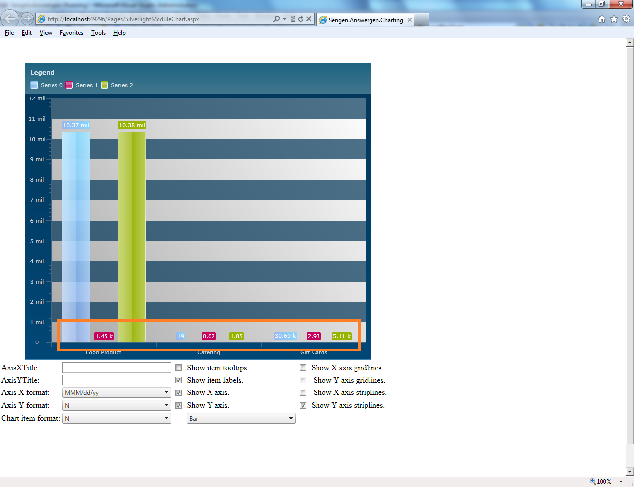 I am having a problem in showing data in radchart silverlight. The y value points are not shown in Radchart after binding. Please see attached file. If the y values are low then it is not showing properly in radchart. And also I would like to know whether radchart silverlight will work in mobile devices. Please reply.
