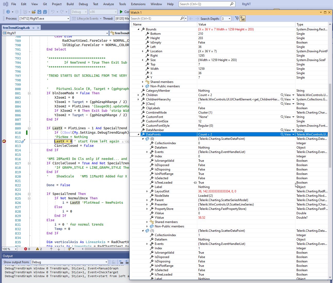 I try to use RadChartView for show graphical lines. I have prepared series of ScatterLineSeries and upload its to RadChartView.Series. First page can show successfully. Unfortunately I can not show next page. I setting break after uploading data to RadChartView. Visual Studio mark by red color any changes (differences) in RadChartView properties and data.