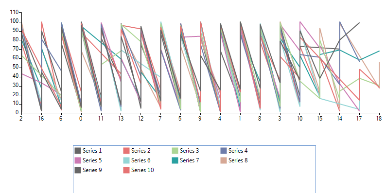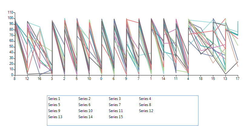 Sub New() InitializeComponent() Dim rand As New Random Dim list As New List(Of LineSeries) For index = 1 To 15 Dim ls As New LineSeries ls.LegendTitle = "Series " & index list.Add(ls) Next For index = 1 To 100 For Each s As LineSeries In list s.DataPoints.Add(New CategoricalDataPoint(index, rand.Next(0, rand.Next(5, 20)))) Next Next Me.RadChartView1.Series.AddRange(list.ToArray()) Me.RadChartView1.ShowLegend = True Me.RadChartView1.ChartElement.LegendPosition = LegendPosition.Bottom End SubFriend Class MyChartInherits RadChartView Protected Overrides Function CreateChartElement() As RadChartElement Return New MyChartElement() End FunctionEnd ClassFriend Class MyChartElementInherits RadChartElement Protected Overrides Function CreateChartLegendElement() As ChartLegendElement Return New MyLegendElement(Me) End Function Protected Overrides ReadOnly Property ThemeEffectiveType() As Type Get Return GetType(RadChartElement) End Get End PropertyEnd ClassFriend Class MyLegendElementInherits ChartLegendElement Private panel As RadListViewElement Public Sub New(chartElement As RadChartElement) MyBase.New(chartElement) End Sub Protected Overrides Sub OnLegendInfosCollectionChanged(e As Telerik.WinControls.Data.NotifyCollectionChangedEventArgs, providerChange As Boolean) MyBase.OnLegendInfosCollectionChanged(e, providerChange) If e.Action = Telerik.WinControls.Data.NotifyCollectionChangedAction.Add Then Dim li As LegendItem = TryCast(e.NewItems(0), LegendItem) panel.Items.Add(li.Title) End If End Sub Protected Overrides Sub CreateChildElements() MyBase.CreateChildElements() panel = New RadListViewElement() panel.StretchHorizontally = True panel.StretchVertically = False panel.ViewType = ListViewType.IconsView panel.ItemSize = New Drawing.Size(100, 20) panel.ShouldHandleMouseInput = True panel.NotifyParentOnMouseInput = False panel.MaxSize = New Drawing.Size(500, 100) Me.StackElement.Visibility = Telerik.WinControls.ElementVisibility.Collapsed Me.Children.Add(panel) End Sub Protected Overrides ReadOnly Property ThemeEffectiveType() As Type Get Return GetType(ChartLegendElement) End Get End PropertyEnd ClassNote that this is just a sample approach and it may not handle all possible cases. Feel free to modify it in a way which suits your requirement best.