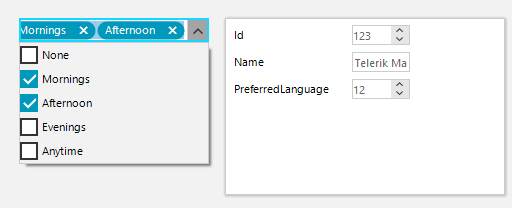 Thank you, Carl, for specifying the additional information. This functionality is a subject custom logic and should be implemented by the developer according to the specific requirements. I can suggest a possible approach and create a custom property in RadCheckedDropDownList which considers the which items are checked and returns the sum of all Ids that are checked. Thus, the value (24) will be stored to the custom object. However, what logic should be followed for checking the items in the drop down when you have stored value 24 in the PreferredLanguage property?