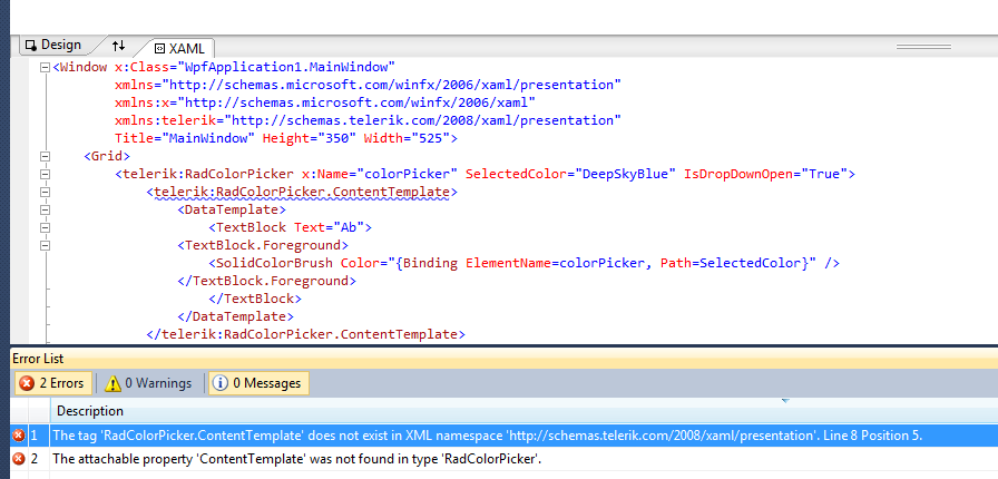 The attachable propert 'ContentTemplate' was not found in type 'RadColorPicker'.