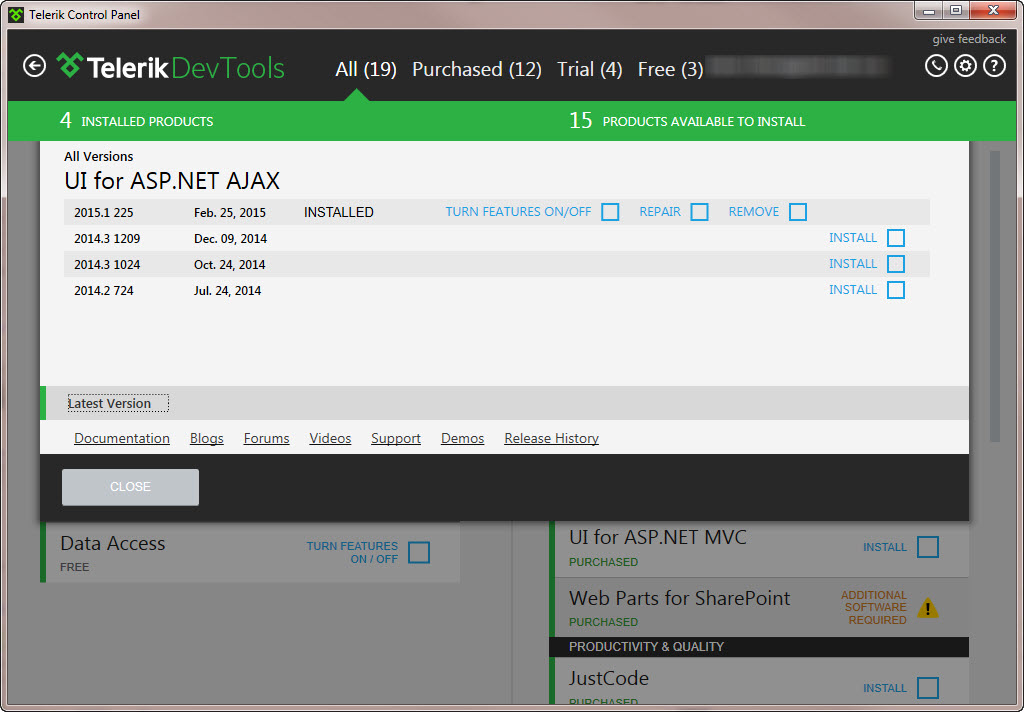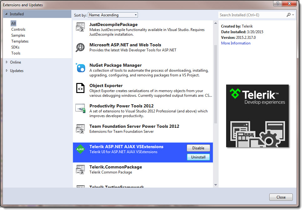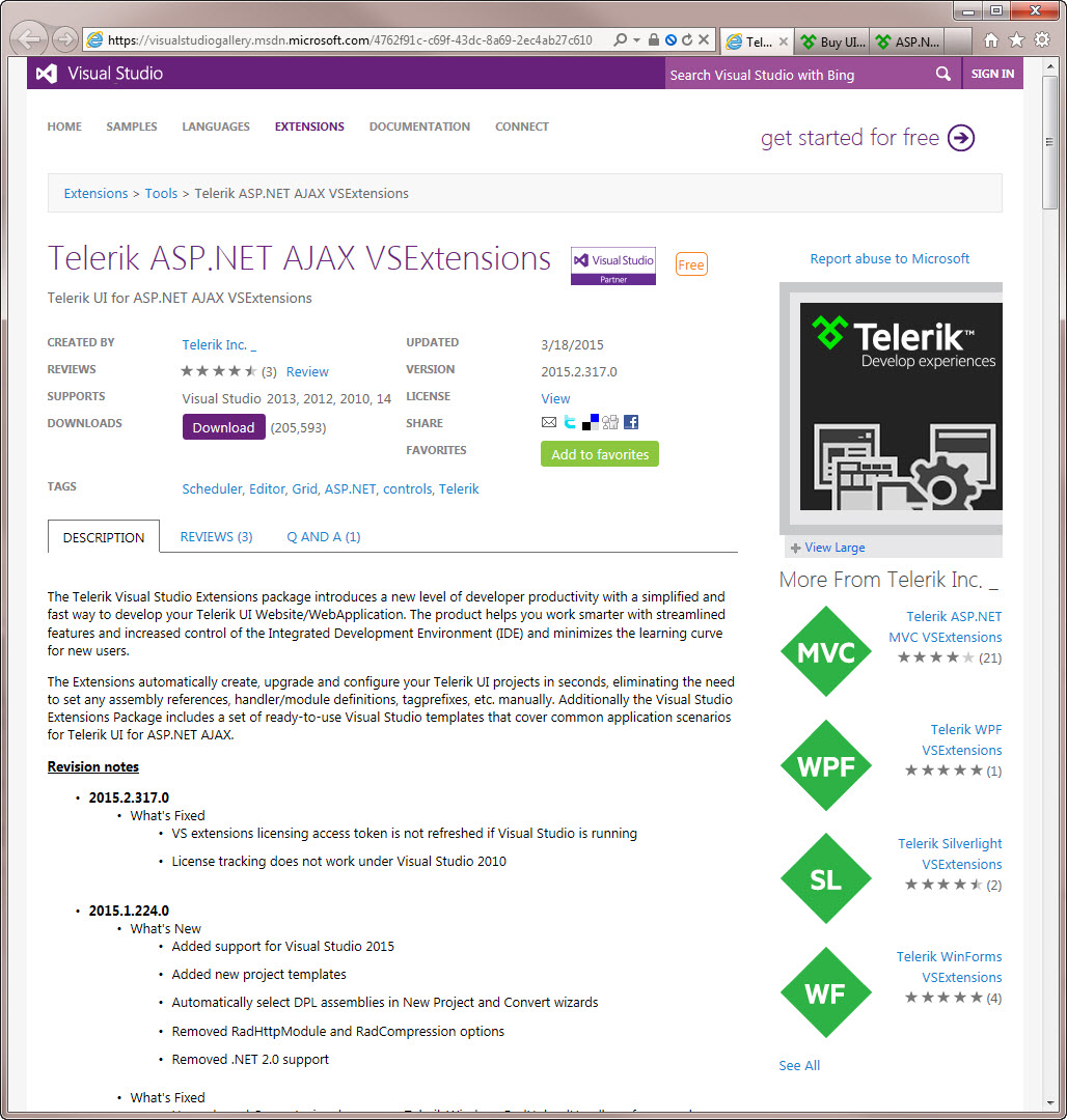 Per the Telerik revision discrepancy, when you told me version 2015.1.255 was the latest version I looked in VS 2012's "Extensions and updates" and saw my version was 2015.1.224. I also saw there was an update to Telerik waiting, so I updated. This updated me to version 2015.2.317.0 (see attached VS2012UpdateScreen.jpg). When I click the “More Information” link as shown on this image, it takes me to the details page as shown in attached image “MicrosoftWebpage.jpg”. This page shows revision 2015.1.224 leading to revision 2015.2.317, with no mention of revision 2015.1.255. On the other hand, when I check through my Telerik Control panel, it shows version 2015.1.255 is what is installed. See attached image TelerikControlPanel.jpg (the name of our purchasing agent is blurred to prevent social engineering attempts). So my questions are, 1) what is the best way to get version 2015.1.255; do I uninstall from VS and re-install from Telerik Control Panel, or uninstall from Telerik Control Panel, and reinstall? I’m concerned that if I uninstall from Telerik Control panel there might be problems, since Telerik Control panel only seems to be aware of version 2015.1.255, and not my real version. 2) Since I’m using Visual Studios update notifications to let me know when/what to update, how to I prevent getting the wrong release “stream” in the future?