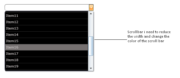 Similarly i need to reduce the width of the scrollbar and its color and I've attached the screenshots for reference.