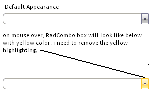 I have set the property of the RadComboBox IsEditable=True and IsReadOnly=True, after setting those properties when mouse reaches the dropdown icon of the RadComboBox the color changes to Yellow and i need to remove that color.
