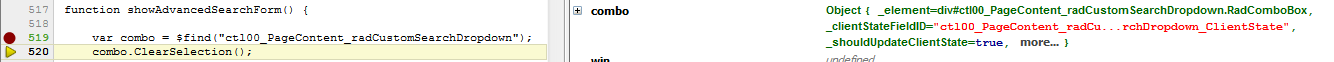 var combo = $find("<%#radCustomSearchDropdown.ClientID %>");This line works as you can see in the attached image. combo now points to the RadComboBox.