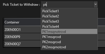 01.<telerik:RadComboBox ItemsSource="{Binding PickTickets}"02. DisplayMemberPath="PickTicketIdentity"03. EmptyText="Please select a pick ticket"<br>04. IsEditable="True"05. IsFilteringEnabled="True"06. TextSearchMode="Contains"07. CanAutocompleteSelectItems="False"08. StaysOpenOnEdit="True"09. SelectedItem="{Binding SelectedPickTicket}"10. KeyDown="RadComboBox_KeyDown"/>