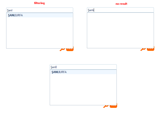 When I write lower (i) its only matching lower (i) but I want to see to it also matched with(upper I) character because in turkish they are same.if I write (upper I) it is matching only (upper I) not lower.Another chacters which are turkish(s,ΓΌ ...) they are always matching lower or upper.if I write (lower i) it is matching with (upper I and I) .lower i is not equal upper I in turkish.When I use load on demand property of combobox, sql query which contains like function get a data exactly what a want.Code adding items list of Radcombobox but filtering dont display record because not matching.How can I fix this problem.