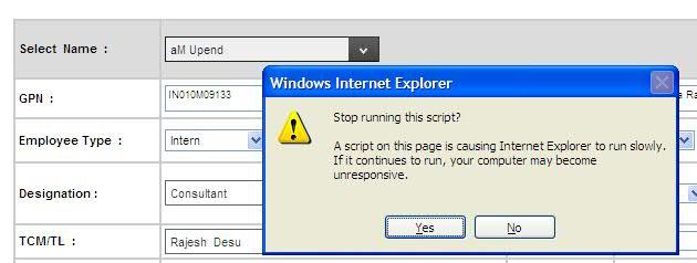 "Stop running this script? A Script on this page is causing Internet Explorer to run slowly. If it continues to run, your computer may become unresponsive. Yes / No"