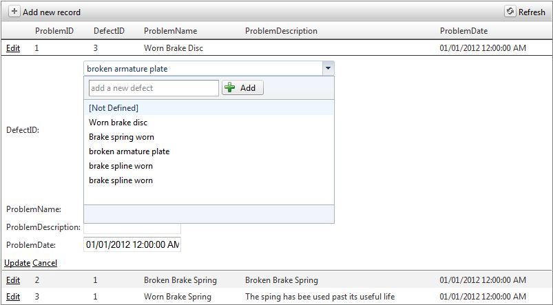 <div><telerik:RadGrid ID="RadGrid1" runat="server" AllowAutomaticDeletes="True" AllowAutomaticInserts="True" AllowAutomaticUpdates="True" CellSpacing="0" DataSourceID="SqlDataSource1" GridLines="None" Width="800px"><MasterTableView AutoGenerateColumns="False" CommandItemDisplay="Top" DataKeyNames="ProblemID" DataSourceID="SqlDataSource1"><CommandItemSettings ExportToPdfText="Export to PDF"></CommandItemSettings><RowIndicatorColumn Visible="True" FilterControlAltText="Filter RowIndicator column"><HeaderStyle Width="20px"></HeaderStyle></RowIndicatorColumn><ExpandCollapseColumn Visible="True" FilterControlAltText="Filter ExpandColumn column"><HeaderStyle Width="20px"></HeaderStyle></ExpandCollapseColumn> <Columns> <telerik:GridEditCommandColumn FilterControlAltText="Filter EditCommandColumn column"> </telerik:GridEditCommandColumn> <telerik:GridBoundColumn DataField="ProblemID" DataType="System.Int32" FilterControlAltText="Filter ProblemID column" HeaderText="ProblemID" ReadOnly="True" SortExpression="ProblemID" UniqueName="ProblemID"> </telerik:GridBoundColumn> <telerik:GridTemplateColumn DataField="DefectID" DataType="System.Int32" FilterControlAltText="Filter DefectID column" HeaderText="DefectID" SortExpression="DefectID" UniqueName="DefectID"> <EditItemTemplate> <telerik:RadAjaxPanel ID="RadAjaxPanel1" runat="server" height="200px" width="300px"> <telerik:RadComboBox ID="DefectComboBox" runat="server" AllowCustomText="True" AppendDataBoundItems="True" DataSourceID="SqlDataSource2" DataTextField="Defect" DataValueField="DefectID" Height="150px" HighlightTemplatedItems="True" SelectedValue='<%# Bind("DefectID") %>' Skin="Windows7" Width="365px"> <Items> <telerik:RadComboBoxItem Selected="True" Text="[Not Defined]" Value="" Owner="DefectComboBox" /> </Items> <WebServiceSettings> <ODataSettings InitialContainerName=""> </ODataSettings> </WebServiceSettings> <HeaderTemplate> <telerik:RadTextBox ID="RadTextBox1" Runat="server" AutoPostBack="True" EmptyMessage="add a new defect" LabelWidth="" Text='<%# Bind("Defect") %>' Width="185px"> </telerik:RadTextBox> <telerik:RadButton ID="addDefect" runat="server" Text="Add"> <Icon PrimaryIconCssClass="rbAdd" /> </telerik:RadButton> </HeaderTemplate> <FooterTemplate> <br /> </FooterTemplate> </telerik:RadComboBox> </telerik:RadAjaxPanel> </EditItemTemplate> <ItemTemplate> <asp:Label ID="DefectIDLabel" runat="server" Text='<%# Eval("DefectID") %>'></asp:Label> </ItemTemplate> </telerik:GridTemplateColumn> <telerik:GridBoundColumn DataField="ProblemName" FilterControlAltText="Filter ProblemName column" HeaderText="ProblemName" SortExpression="ProblemName" UniqueName="ProblemName"> </telerik:GridBoundColumn> <telerik:GridBoundColumn DataField="ProblemDescription" FilterControlAltText="Filter ProblemDescription column" HeaderText="ProblemDescription" SortExpression="ProblemDescription" UniqueName="ProblemDescription"> </telerik:GridBoundColumn> <telerik:GridBoundColumn DataField="ProblemDate" DataType="System.DateTime" FilterControlAltText="Filter ProblemDate column" HeaderText="ProblemDate" SortExpression="ProblemDate" UniqueName="ProblemDate"> </telerik:GridBoundColumn> </Columns><EditFormSettings><EditColumn FilterControlAltText="Filter EditCommandColumn column"></EditColumn></EditFormSettings></MasterTableView><FilterMenu EnableImageSprites="False"><WebServiceSettings><ODataSettings InitialContainerName=""></ODataSettings></WebServiceSettings></FilterMenu><HeaderContextMenu CssClass="GridContextMenu GridContextMenu_Default"><WebServiceSettings><ODataSettings InitialContainerName=""></ODataSettings></WebServiceSettings></HeaderContextMenu> </telerik:RadGrid> <asp:SqlDataSource ID="SqlDataSource1" runat="server" ConnectionString="<%$ ConnectionStrings:ConnectionString %>" DeleteCommand="DELETE FROM [Problems] WHERE [ProblemID] = @ProblemID" InsertCommand="INSERT INTO [Problems] ([DefectID], [ProblemName], [ProblemDescription], [ProblemDate]) VALUES (@DefectID, @ProblemName, @ProblemDescription, @ProblemDate)" SelectCommand="SELECT * FROM [Problems]" UpdateCommand="UPDATE [Problems] SET [DefectID] = @DefectID, [ProblemName] = @ProblemName, [ProblemDescription] = @ProblemDescription, [ProblemDate] = @ProblemDate WHERE [ProblemID] = @ProblemID"> <DeleteParameters> <asp:Parameter Name="ProblemID" Type="Int32" /> </DeleteParameters> <InsertParameters> <asp:Parameter Name="DefectID" Type="Int32" /> <asp:Parameter Name="ProblemName" Type="String" /> <asp:Parameter Name="ProblemDescription" Type="String" /> <asp:Parameter Name="ProblemDate" Type="DateTime" /> </InsertParameters> <UpdateParameters> <asp:Parameter Name="DefectID" Type="Int32" /> <asp:Parameter Name="ProblemName" Type="String" /> <asp:Parameter Name="ProblemDescription" Type="String" /> <asp:Parameter Name="ProblemDate" Type="DateTime" /> <asp:Parameter Name="ProblemID" Type="Int32" /> </UpdateParameters> </asp:SqlDataSource> <asp:SqlDataSource ID="SqlDataSource2" runat="server" ConnectionString="<%$ ConnectionStrings:ConnectionString %>" SelectCommand="SELECT [DefectID], [Defect] FROM [Defects]"> </asp:SqlDataSource> <asp:ScriptManager ID="ScriptManager1" runat="server"> </asp:ScriptManager> <asp:SqlDataSource ID="SqlDataSource3" runat="server" ConnectionString="<%$ ConnectionStrings:ConnectionString %>" DeleteCommand="DELETE FROM [Defects] WHERE [DefectID] = @DefectID" InsertCommand="INSERT INTO [Defects] ([Defect]) VALUES (@Defect)" SelectCommand="SELECT [DefectID], [Defect] FROM [Defects]" UpdateCommand="UPDATE [Defects] SET [Defect] = @Defect WHERE [DefectID] = @DefectID"> <DeleteParameters> <asp:Parameter Name="DefectID" Type="Int32" /> </DeleteParameters> <InsertParameters> <asp:Parameter Name="Defect" Type="String" /> </InsertParameters> <UpdateParameters> <asp:Parameter Name="Defect" Type="String" /> <asp:Parameter Name="DefectID" Type="Int32" /> </UpdateParameters> </asp:SqlDataSource> <telerik:RadAjaxLoadingPanel ID="RadAjaxLoadingPanel1" Runat="server" Skin="Default"> </telerik:RadAja