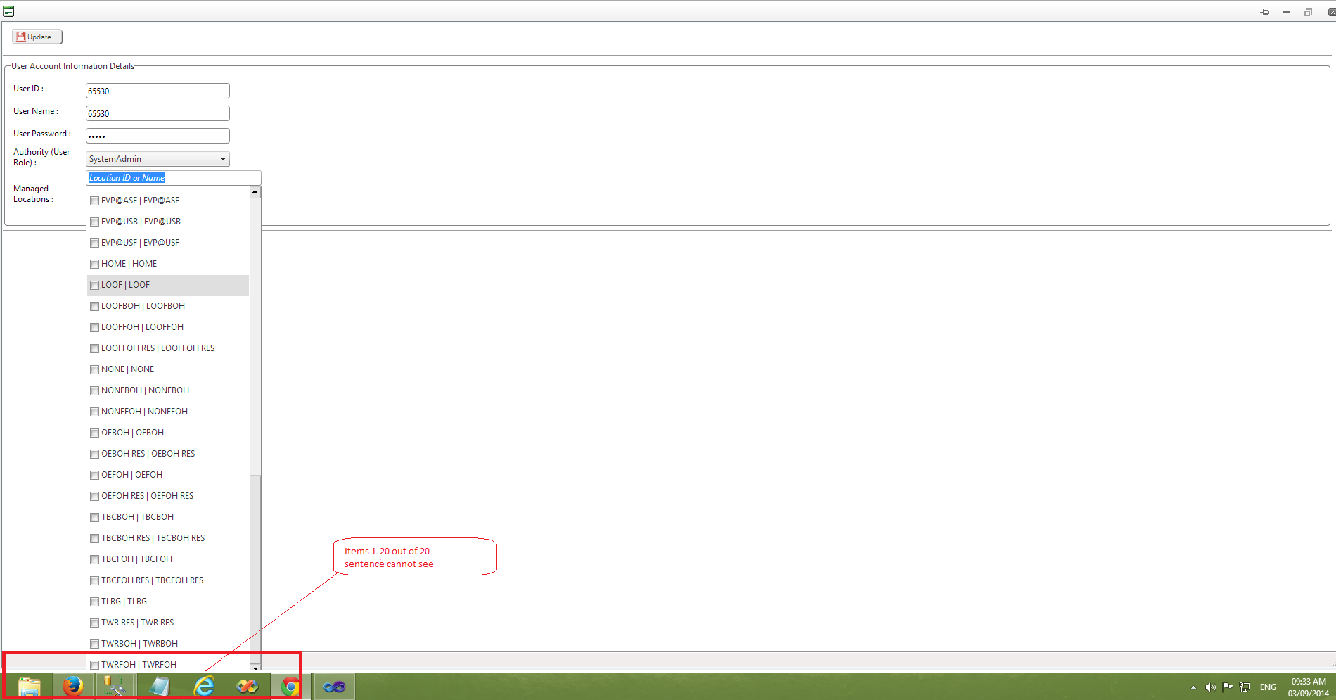 <telerik:RadComboBox ID="cboLocation" EmptyMessage="Location ID or Name" Width="250px" CheckBoxes="true" Skin="Default" EnableLoadOnDemand="True" ShowMoreResultsBox="true" ForeColor="Black" EnableVirtualScrolling="true" Font-Size="12px" OnClientItemChecked="OnClientItemCheckedLoc" OnClientDropDownClosed="OnClientDropDownClosedLoc" AutoPostBack="false" runat="server" OnItemsRequested="cboLocation_ItemsRequested" EnableCheckAllItemsCheckBox="true" OnClientBlur="IsCheckAllSelectedLoc" ShowToggleImage="false" ZIndex="1000000" ></telerik:RadComboBox>The problem I am facing now is I can't see Show more result when I maximized the Radwindow. Please see attached image for example. If I don't maximized the radwindow Dropdown top bar will hide under browser bookmark bar. I tried to put ItemsPerRequest , but it is still now working. Can anyone help me?