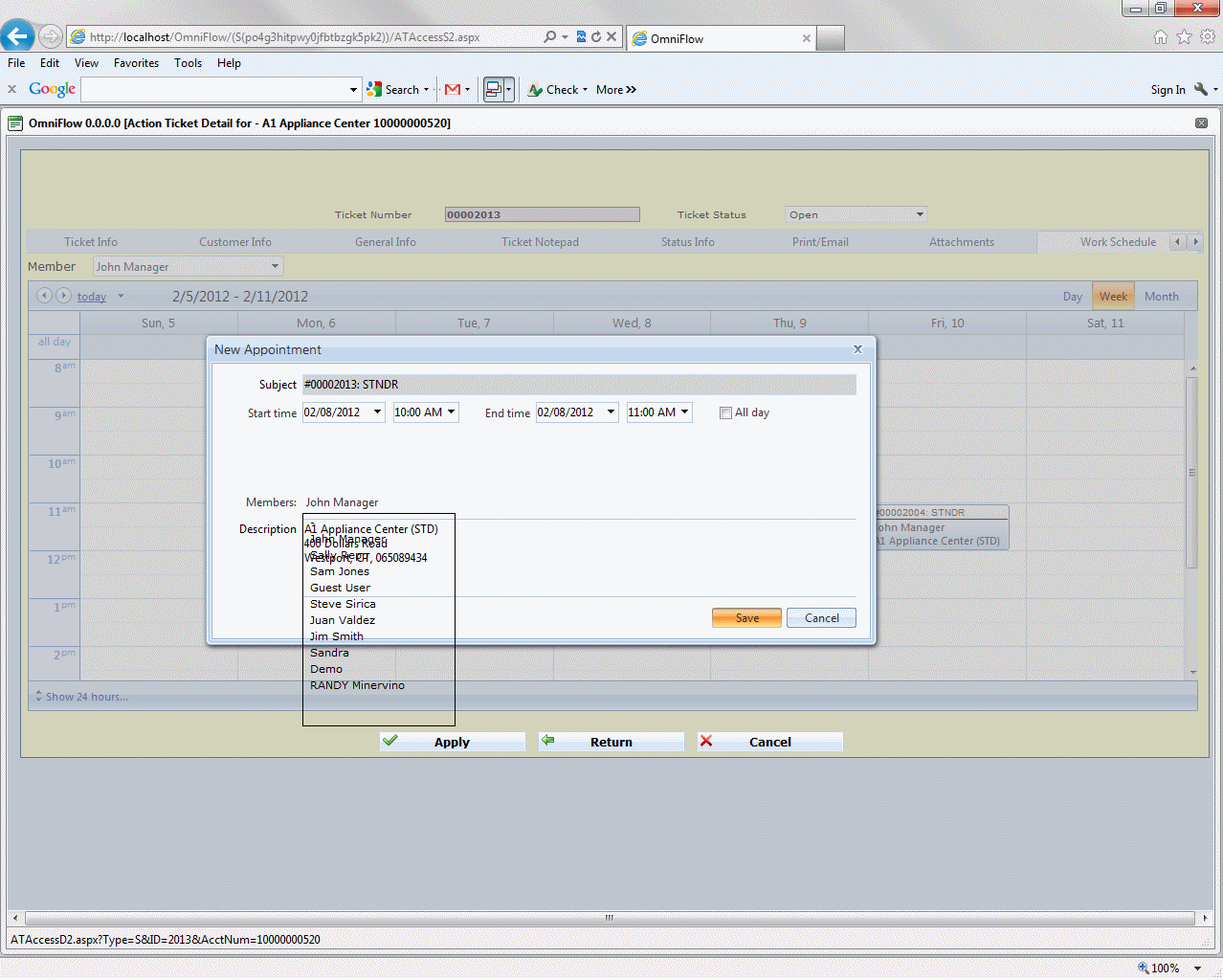 Protected Sub rsATSch_FormCreated(ByVal sender As Object, ByVal e As Telerik.Web.UI.SchedulerFormCreatedEventArgs) Handles rsATSch.FormCreated Dim txtSubject As Telerik.Web.UI.RadTextBox = DirectCast(e.Container.FindControl("Subject"), Telerik.Web.UI.RadTextBox) Dim txtDesc As Telerik.Web.UI.RadTextBox = DirectCast(e.Container.FindControl("Description"), Telerik.Web.UI.RadTextBox) Dim cbMembers As Telerik.Web.UI.RadComboBox = DirectCast(e.Container.FindControl("ResMembers"), Telerik.Web.UI.RadComboBox) Dim txtUserName As Telerik.Web.UI.RadTextBox = DirectCast(e.Container.FindControl("AttrMember"), Telerik.Web.UI.RadTextBox) Dim txtEmail As Telerik.Web.UI.RadTextBox = DirectCast(e.Container.FindControl("AttrEmail"), Telerik.Web.UI.RadTextBox) Dim rdpStart As Telerik.Web.UI.RadDatePicker = DirectCast(e.Container.FindControl("StartDate"), Telerik.Web.UI.RadDatePicker) Dim rtpStart As Telerik.Web.UI.RadTimePicker = DirectCast(e.Container.FindControl("StartTime"), Telerik.Web.UI.RadTimePicker) Dim rdpEnd As Telerik.Web.UI.RadDatePicker = DirectCast(e.Container.FindControl("EndDate"), Telerik.Web.UI.RadDatePicker) Dim rtpEnd As Telerik.Web.UI.RadTimePicker = DirectCast(e.Container.FindControl("EndTime"), Telerik.Web.UI.RadTimePicker) Dim txtActTickID As Telerik.Web.UI.RadTextBox = DirectCast(e.Container.FindControl("AttrAction Ticket"), Telerik.Web.UI.RadTextBox) If e.Container.Mode = SchedulerFormMode.AdvancedInsert Then txtSubject.Text = "#" & txtTicketNum.Text.ToString & ": " & ddlActCode.SelectedItem.Text.ToString txtDesc.Text = txtAcctName.Text.ToString & " (" & txtAcctType.Text.ToString & ")" & vbCrLf txtDesc.Text += txtAddr1.Text.ToString & vbCrLf txtDesc.Text += txtCity.Text.ToString & ", " & txtState.Text.ToString & ", " & txtZipCode.Text.ToString cbMembers.SelectedIndex = ddlMemberB.SelectedIndex End If txtSubject.ReadOnly = True txtSubject.BackColor = Drawing.Color.LightGray txtUserName.Visible = False txtEmail.Visible = False txtActTickID.Visible = False cbMembers.ZIndex = 300000