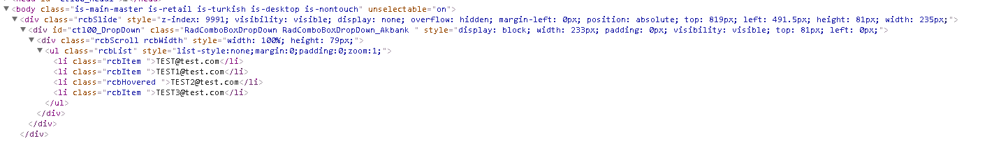 I am using RadComboBox and have an issue about this control. I am creating RadComboBox on server side and keep this control as Html like in .png. Everthing works fine on this situation. But when I try to update items for adding or removing any item, rcbSlide in body not updated, thats why combox does not display updated items. How can sync both rcbSlide in body and radcombox div? I tried copy html from div to body but, it does not work. Also when I close and reopen project new items displayed in combo. It seems body cache the items but I can not find have can I refresh items?