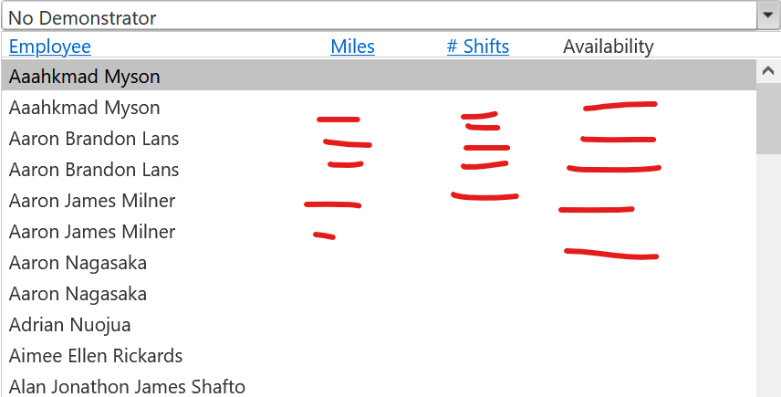 { EmployeeID = 716, EmpFullName = "Feryal Allaoui", FirstName = "Feryal", LastName = "Allaoui", TrainingSpare = false, AreaSpare = false, KsDistance = "11.06", ThisWeeksDemoCount = 0, fnIEA = 0, AvailText = "" ... }