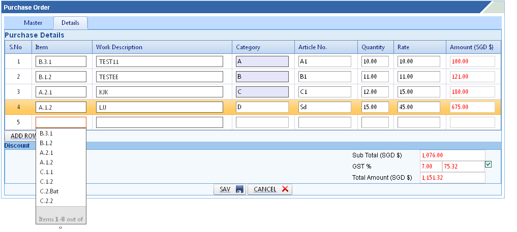 when i click Add row button clear the first and second column are empty to bind (see My Po1 image)