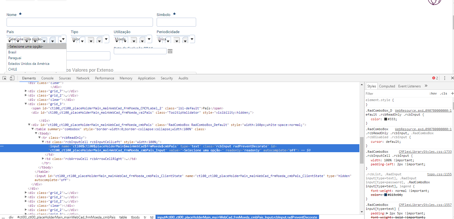 <td class="rcbInputCell rcbInputCellLeft" style="width:100%;"><input name="ctl00$ctl00$placeHolderMain$mainWebCad$frmMoeda$cmbPais" type="text" class="rcbInput radPreventDecorate" id="ctl00_ctl00_placeHolderMain_mainWebCad_frmMoeda_cmbPais_Input" value="-Selecione uma opção-" readonly="readonly" autocomplete="off"></td><td class="rcbArrowCell rcbArrowCellRight"><a id="ctl00_ctl00_placeHolderMain_mainWebCad_frmMoeda_cmbPais_Arrow" style="overflow: hidden;display: block;position: relative;outline: none;">select</a></td>