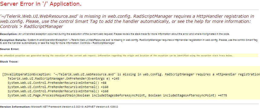 '~/Telerik.Web.UI.WebResource.axd' is missing in web.config. RadScriptManager requires a HttpHandler registration in web.config. Please, use the control Smart Tag to add the handler automatically, or see the help for more information: Controls > RadScriptManager