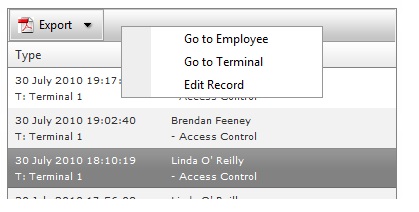 <asp:SqlDataSource ID="SqlDataSource_PT20" runat="server"> </asp:SqlDataSource> </asp:PlaceHolder> <asp:PlaceHolder ID="PlaceHolder2" runat="server"> <input type="hidden" id="RadGridClickedRowIndex" name="RadGridClickedRowIndex" value="1" /> <telerik:RadGrid ID="RadGrid_PT20" runat="server" AutoGenerateColumns="false" AllowMultiRowSelection="false" AllowPaging="True" AllowCustomPaging="True" PageSize="15" AllowAutomaticInserts="false" GridLines="None" CellPadding="0" AllowSorting="false" Skin="Default" OnItemDataBound="Att_Log_Translate" ItemStyle-VerticalAlign="Top" OnNeedDataSource="RadGrid_PT20_NeedDataSource"> <ExportSettings IgnorePaging="false" OpenInNewWindow="true"> <Pdf PageHeight="297mm" PageWidth="210mm" PageTitle="OnTime System Logs" /> </ExportSettings> <PagerStyle Mode="NextPrevAndNumeric"/> <MasterTableView Width="100%" CommandItemDisplay="Top" GridLines="None" AllowAutomaticInserts="false"> <CommandItemSettings ShowAddNewRecordButton="false" /> <CommandItemTemplate> <telerik:RadToolBar ID="RadToolBar_PT20" runat="server" Skin="Default" OnButtonClick="RadToolBar_PT20_CommandClick"> <Items> <telerik:RadToolBarDropDown Text="Export" ImageUrl="Images/pdf_icon.gif"> <Buttons> <telerik:RadToolBarButton Text="Export Current View" Group="Bold" CheckOnClick="true" AllowSelfUnCheck="true" CommandName="ExportToPDF" ImageUrl="Images/pdf_icon.gif"/> <telerik:RadToolBarButton Text="Export All Records" Group="Italic" CheckOnClick="true" AllowSelfUnCheck="true" /> </Buttons> </telerik:RadToolBarDropDown> </Items> </telerik:RadToolBar> </CommandItemTemplate> <Columns> <telerik:GridBoundColumn UniqueName="Log_ID" DataField="Attendance_Logs_Auto_ID" HeaderText="Log ID" Visible="false"/> <telerik:GridBoundColumn UniqueName="Employee_First_Name" DataField="Employee_First_Name" HeaderText="First Name" Visible="false"/> <telerik:GridTemplateColumn UniqueName="PT20_Left_Column" HeaderText="Type" HeaderStyle-Width="40%"> <ItemTemplate> <asp:Panel ID="Panel3" runat="server" CssClass="logs_table_text"> <asp:Literal ID="Literal_Att_Logs_DateTime" runat="server" Text='<%# Eval("Attendance_Logs_DateTime").ToString() %>'></asp:Literal> <br /> <asp:Literal ID="Literal2" runat="server" meta:resourcekey="Literal2Resource1" Text="T: "></asp:Literal> <asp:Literal ID="Literal_Att_Logs_Terminal_Name" runat="server" Text='<%# Eval("Terminal_Name").ToString() %>'></asp:Literal> </asp:Panel> </ItemTemplate> </telerik:GridTemplateColumn> <telerik:GridTemplateColumn UniqueName="PT20_Right_Column" HeaderText="Description" HeaderStyle-Width="60%"> <ItemTemplate> <asp:Panel ID="Panel4" runat="server" CssClass="logs_table_text" > <asp:Literal ID="Literal_Att_Logs_Employee_Name" runat="server" Text='<%# Eval("Employee_First_Name").ToString() %>'></asp:Literal> <asp:Literal ID="Literal_Att_Logs_Employee_Name1" runat="server" Text='<%# Eval("Employee_Last_Name").ToString() %>'></asp:Literal> <br /> <asp:Literal ID="Literal1" runat="server" meta:resourcekey="Literal1Resource1" Text="-"> </asp:Literal> <asp:Literal ID="Literal_Att_Logs_Type" runat="server" Text='<%# Eval("Attendance_Logs_Type").ToString() %>'> </asp:Literal> </asp:Panel> </ItemTemplate> </telerik:GridTemplateColumn> </Columns> </MasterTableView> <ClientSettings> <Selecting AllowRowSelect="true" /> <ClientEvents OnRowContextMenu="PT20_ContextMenu"></ClientEvents> </ClientSettings> </telerik:RadGrid> <telerik:RadContextMenu ID="RadMenu_PT20" runat="server" OnItemClick="RadMenu_PT20_ItemClick" Skin="Default" > <Items> <telerik:RadMenuItem Text="Go to Employee" /> <telerik:RadMenuItem Text="Go to Terminal" /> <telerik:RadMenuItem Text="Edit Record" /> </Items> <Targets> <telerik:ContextMenuControlTarget ControlID="RadGrid_PT20"/> </Targets> </telerik:RadContextMenu>