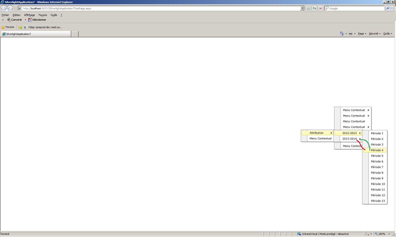 <UserControl x:Class="SilverlightApplication7.MainPage" xmlns:telerik="http://schemas.telerik.com/2008/xaml/presentation" mc:Ignorable="d" d:DesignHeight="300" d:DesignWidth="400"> <Grid x:Name="LayoutRoot" Background="White"> <telerik:RadContextMenu.ContextMenu> <telerik:RadContextMenu x:Name="radCmMenuContextuel" > <telerik:RadMenuItem Header="Menu Contextuel"> <telerik:RadMenuItem Header="Menu Contextuel" /> </telerik:RadMenuItem> <telerik:RadMenuItem Header="Menu Contextuel"> <telerik:RadMenuItem Header="Menu Contextuel" /> <telerik:RadMenuItem Header="Menu Contextuel" /> <telerik:RadMenuItem Header="Menu Contextuel" /> <telerik:RadMenuItem Header="Menu Contextuel" /> <telerik:RadMenuItem Header="Menu Contextuel" /> <telerik:RadMenuItem Header="Menu Contextuel" /> <telerik:RadMenuItem Header="Menu Contextuel" /> <telerik:RadMenuItem Header="Menu Contextuel" /> <telerik:RadMenuItem Header="Menu Contextuel" /> <telerik:RadMenuItem Header="Menu Contextuel" /> <telerik:RadMenuItem Header="Menu Contextuel" /> <telerik:RadMenuItem Header="Menu Contextuel" /> <telerik:RadMenuItem Header="Menu Contextuel" /> </telerik:RadMenuItem> <telerik:RadMenuItem Header="Menu Contextuel" /> <telerik:RadMenuItem Header="Menu Contextuel"> <telerik:RadMenuItem Header="Menu Contextuel" /> <telerik:RadMenuItem Header="Menu Contextuel" /> <telerik:RadMenuItem Header="Menu Contextuel" /> <telerik:RadMenuItem Header="Menu Contextuel" /> <telerik:RadMenuItem Header="Menu Contextuel" /> </telerik:RadMenuItem> <telerik:RadMenuItem Header="Rapport"> <telerik:RadMenuItem Header="Attribution"> <telerik:RadMenuItem Header="2012-2013"> <telerik:RadMenuItem Header="Période 1" /> <telerik:RadMenuItem Header="Période 2" /> <telerik:RadMenuItem Header="Période 3" /> <telerik:RadMenuItem Header="Période 4" /> <telerik:RadMenuItem Header="Période 5" /> <telerik:RadMenuItem Header="Période 6" /> <telerik:RadMenuItem Header="Période 7" /> <telerik:RadMenuItem Header="Période 8" /> <telerik:RadMenuItem Header="Période 9" /> <telerik:RadMenuItem Header="Période 10" /> <telerik:RadMenuItem Header="Période 11" /> <telerik:RadMenuItem Header="Période 12" /> <telerik:RadMenuItem Header="Période 13" /> </telerik:RadMenuItem> <telerik:RadMenuItem Header="2013-2014"> <telerik:RadMenuItem Header="Période 1" /> <telerik:RadMenuItem Header="Période 2" /> <telerik:RadMenuItem Header="Période 3" /> <telerik:RadMenuItem Header="Période 4" /> <telerik:RadMenuItem Header="Période 5" /> <telerik:RadMenuItem Header="Période 6" /> <telerik:RadMenuItem Header="Période 7" /> <telerik:RadMenuItem Header="Période 8" /> <telerik:RadMenuItem Header="Période 9" /> <telerik:RadMenuItem Header="Période 10" /> <telerik:RadMenuItem Header="Période 11" /> <telerik:RadMenuItem Header="Période 12" /> <telerik:RadMenuItem Header="Période 13" /> </telerik:RadMenuItem> </telerik:RadMenuItem> <telerik:RadMenuItem Header="Menu Contextuel" /> </telerik:RadMenuItem> <telerik:RadMenuItem IsSeparator="True" /> <telerik:RadMenuItem Header="Menu Contextuel" /> <telerik:RadMenuItem Header="Menu Contextuel" /> </telerik:RadContextMenu> </telerik:RadContextMenu.ContextMenu> </Grid></UserControl>Here is the steps to reproduce the problem: