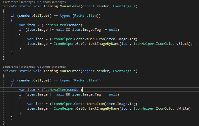 I have now added images to the context menu items however I when they are NOT hovered over they are black outline icons, when the ARE hovered (as the background colour is dark) I would like to change the icons to a White outline icon. I cannot see how to do this with this implementation as I cannot directly access the RadMenuItem. My thought was to use the MouseEnter and MouseLeave events - but it seems the RadMenuItem during the mouse leave event has a NULL image.tag (which I use to store the image name). Would you have any guidance on this ?