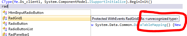 I am not really sure what the problem is on your side. If the code-behind intellisense does not recognize the RadGrid control type, you should make sure that the Telerik.Web.UI library is imported. If this is not the issue, please provide more detailed description of the situation.