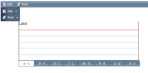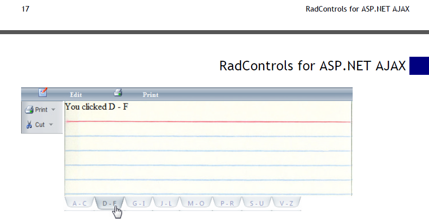 <%@ Page Language="C#" AutoEventWireup="true" CodeBehind="Default.aspx.cs" Inherits="WebApplication3.Default" %><%@ Register Assembly="Telerik.Web.UI" Namespace="Telerik.Web.UI" TagPrefix="telerik" %><!DOCTYPE html PUBLIC "-//W3C//DTD XHTML 1.0 Transitional//EN" "http://www.w3.org/TR/xhtml1/DTD/xhtml1-transitional.dtd"><html xmlns="http://www.w3.org/1999/xhtml"><head runat="server"> <title>Getting Started</title> <style type="text/css" media="screen"> #content { background-image: url('images/3X5card.png'); height: 165px; width: 500px; margin-left: 75px; vertical-align: top; } #tabs { margin-left: 75px; width: 500px; vertical-align: bottom; } </style></head><body> <form id="form1" runat="server"> <div> <telerik:RadAjaxManager ID="RadAjaxManager1" runat="server" UpdatePanelsRenderMode="Inline"> <AjaxSettings> <telerik:AjaxSetting AjaxControlID="RadMenu1"> <UpdatedControls> <telerik:AjaxUpdatedControl ControlID="RadMenu1" UpdatePanelRenderMode="Inline" /> </UpdatedControls> </telerik:AjaxSetting> </AjaxSettings> </telerik:RadAjaxManager> <asp:ScriptManager ID="ScriptManager1" runat="server"> </asp:ScriptManager> <telerik:RadMenu ID="RadMenu1" runat="server" Skin="WebBlue" OnItemClick="RadMenu1_ItemClick" Width="100%"> <CollapseAnimation Type="OutQuint" Duration="200" /> <Items> <telerik:RadMenuItem runat="server" ImageUrl="~/images/EditInformationHS.png" Text="Edit"> <Items> <telerik:RadMenuItem runat="server" ImageUrl="~/images/CutHS.png" Text="Cut"> </telerik:RadMenuItem> <telerik:RadMenuItem runat="server" ImageUrl="~/images/CopyHS.png" Text="Copy"> </telerik:RadMenuItem> <telerik:RadMenuItem runat="server" ImageUrl="~/images/PasteHS.png" Text="Paste"> </telerik:RadMenuItem> </Items> </telerik:RadMenuItem> <telerik:RadMenuItem runat="server" ImageUrl="~/images/PrintHS.png" Text="Print"> <Items> <telerik:RadMenuItem runat="server" ImageUrl="~/images/PrintHS.png" Text="Print"> </telerik:RadMenuItem> <telerik:RadMenuItem runat="server" ImageUrl="~/images/PrintPreviewHS.png" Text="Print Preview"> </telerik:RadMenuItem> </Items> </telerik:RadMenuItem> </Items> </telerik:RadMenu> <telerik:RadToolBar ID="RadToolBar1" runat="server" Orientation="Vertical" SingleClick="None" Skin="WebBlue" Width="80px" OnButtonClick="RadToolBar1_ButtonClick"> <CollapseAnimation Type="OutQuint" Duration="200" /> <Items> <telerik:RadToolBarDropDown runat="server" ImageUrl="~/images/EditInformationHS.png" Text="Edit"> <Buttons> <telerik:RadToolBarButton runat="server" ImageUrl="~/images/CutHS.png" Text="Cut"> </telerik:RadToolBarButton> <telerik:RadToolBarButton runat="server" ImageUrl="~/images/CopyHS.png" Text="Copy"> </telerik:RadToolBarButton> <telerik:RadToolBarButton runat="server" ImageUrl="~/images/PasteHS.png" Text="Paste"> </telerik:RadToolBarButton> </Buttons> </telerik:RadToolBarDropDown> <telerik:RadToolBarSplitButton runat="server" ImageUrl="~/images/PrintHS.png" Text="Print"> <Buttons> <telerik:RadToolBarButton runat="server" ImageUrl="~/images/PrintHS.png" Text="Print"> </telerik:RadToolBarButton> <telerik:RadToolBarButton runat="server" ImageUrl="~/images/PrintPreviewHS.png" Text="Print Preview"> </telerik:RadToolBarButton> </Buttons> </telerik:RadToolBarSplitButton> </Items> </telerik:RadToolBar> <div id="content" runat="server"> <asp:Label ID="lblContent" runat="server" Text="Label"></asp:Label> </div> <div id="tabs" runat="server"> <telerik:RadTabStrip ID="RadTabStrip1" runat="server" OnTabClick="RadTabStrip1_TabClick" Orientation="HorizontalBottom" SelectedIndex="0" Skin="WebBlue" Width="530px"> </telerik:RadTabStrip> </div> </div> </form></body></html>
